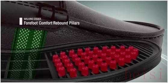 老年人随着年龄的增长,骨质硬化、骨质疏松十分常见,随之而来的问题是室外行走对膝盖和足踝的磨损,以及行动中容易崴脚扭伤,GM长者鞋在前足大底加入中空回弹支柱群,受力反弹,缓冲压力,助力行走。