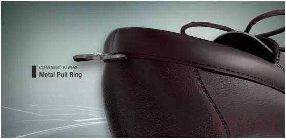 考虑到老年人弯腰穿鞋的不便,GM长者鞋增加了两个小小的人性化设计,一是将原来的普通鞋带改为高弹力拉伸式鞋带,这款鞋带弹力十足,在系好以后,无须解开即可穿脱,方便快捷,在鞋后跟,增加了GM标识的金属拉环,取代了鞋拔的作用,老年人穿鞋时只需轻轻勾动即可将鞋穿上,贴心的设计十分适合老年人使用。