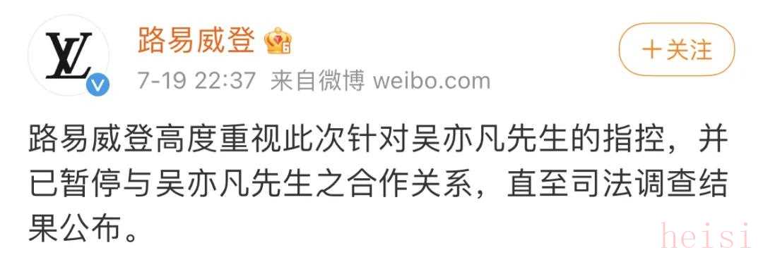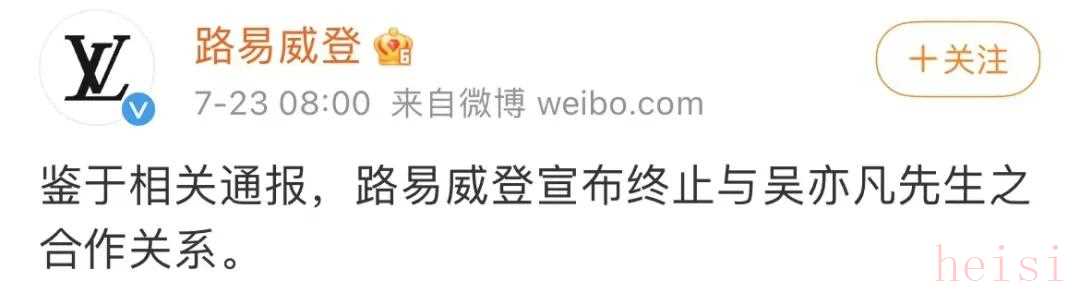 23日早8点,法国高奢品牌路易威登(LV)中国区官博@路易威登 发布声明,称鉴于相关通报,宣布终止与吴亦凡的合作关系。