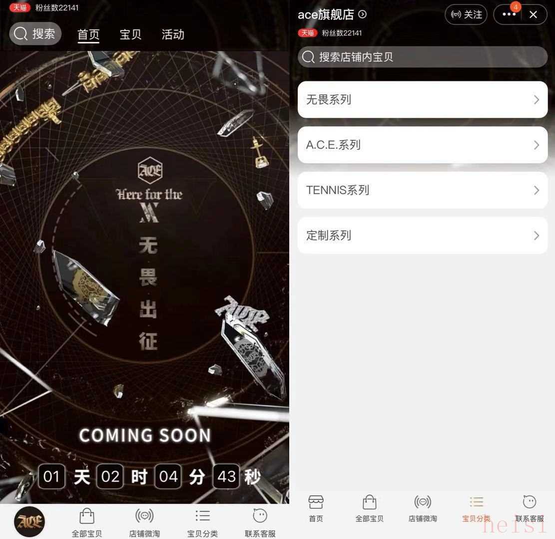 目前A.C.E品牌天猫旗舰店还没有上架商品,品牌将于12月18日晚八点正式亮相。目前可见A.C.E共有无畏系列、A.C.E系列、TENNIE系列和高级定制共四个系列。