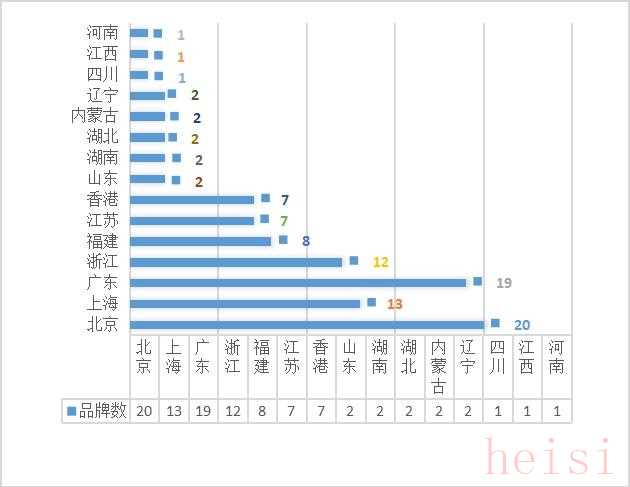 从品牌的省、自治区、直辖市或特区分布看,北京20个,广东19个,上海13个,浙江12个,福建8个,江苏7个,香港7个,山东2个,湖南2个,湖北2个,内蒙古2个,辽宁2个,四川、江西和河南各1个(参见图2)。