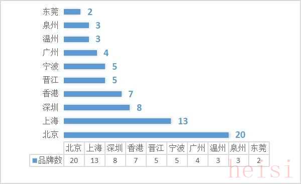 从品牌的城市分布看,北京20个,上海13个,深圳8个,香港7个,晋江5个,宁波5个,广州4个,温州3个,泉州3个,东莞2个(参见图3)。