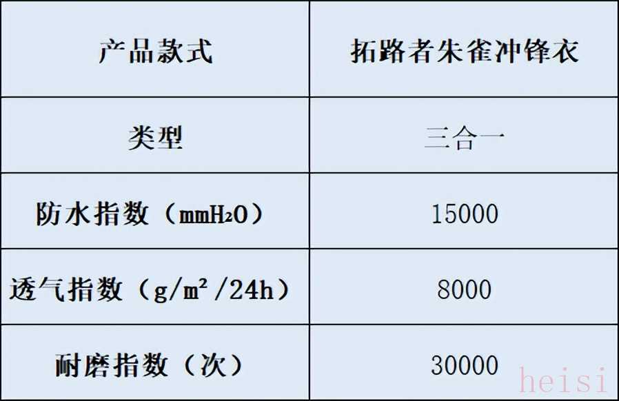 核心性能:防水指数:25000mm,透湿率:12000g/m²/24h,面料技术:TEFLON®三防科技,排汗效率:比普通面料高30%;