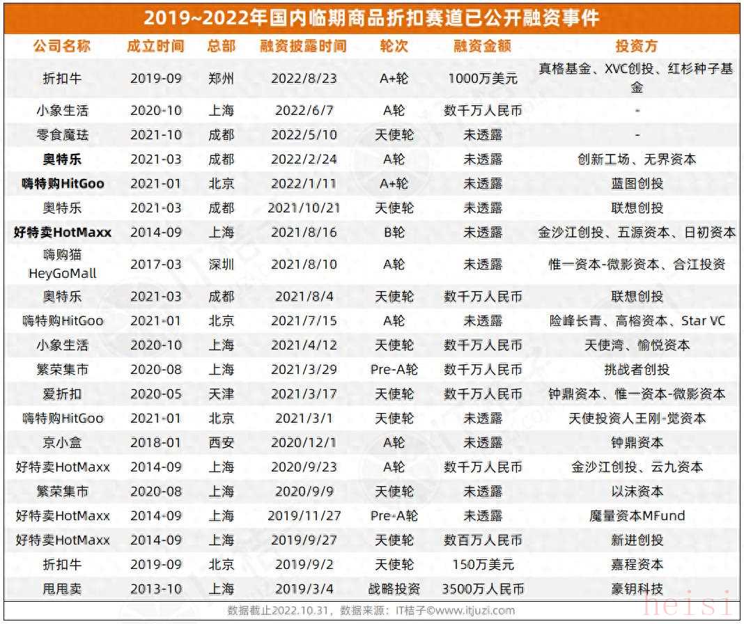 作者:吴梅梅 来源:IT桔子“打折的价格,不打折的快乐” “大牌的商品,3折的价格” “花小钱买个新鲜”自2020年以来,线下临期食品折扣店这种很接地气的生意巧妙地击中了消费者的小心思,一时间人群蜂拥而至,门店红红火火,连高大上的资本也来“光顾”了。据IT桔子统计,真正出钱参与了这一消费潮流投资的国内风投机构就有35家,其中包括红杉中国(红杉种子基金)、真格基金、创新工场、金沙江创投、五源资本等一线资本。有的机构甚至在临期食品赛道接连出手投了两个同类项目,比如惟一资本(微影资本)在2021年分别投了爱折扣(原名食惠邦)的天使轮和嗨购猫HeyGoMall的A轮。那么,两年多过去了,整个赛道、行业出现了哪些变化?那些得到融资的公司经营现状又如何呢?
