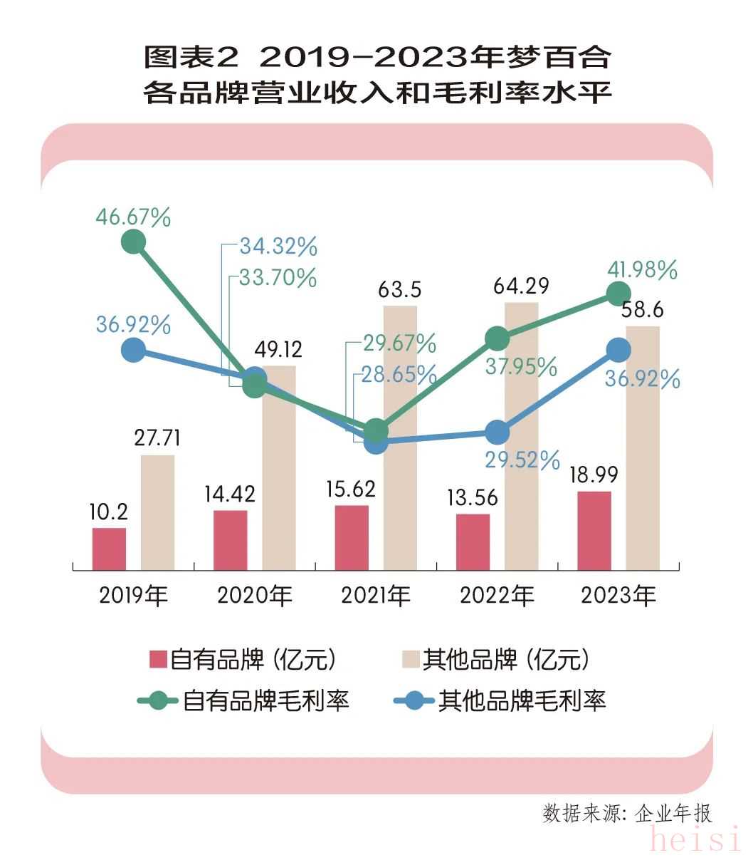 如图表1所示,家居行业的微笑曲线的两端——核心技术和品牌,掌握它们的企业在价值链中收益分割当中会占取更大部分,而“制造”环节作为微笑曲线的底端,在整个产业价值链中利益分割里处于不利地位。因此,家居制造业如果要发展的话,就必然需要往两端走,一端是往核心技术,另一端往品牌。早期我国家居企业大多以OEM或ODM起家,梦百合也不例外。不过近几年来不少家居企业逐渐转型OBM,往微笑曲线的两端走,加强自主品牌营销力度,发展更高利润模式,敏华控股就是已经完成转型的典型代表。虽然梦百合在自有品牌的培养方向中早有布局,但是截至2021年自主品牌优势尚不够显著。分品牌来看,2019-2023年,近五年公司自有品牌营业收入分别为10.20亿元、14.42亿元、15.62亿元、13.56亿元、18.99亿元,占公司主营业收入比重基本维持在20%左右,其他品牌营业收入占比高达70%以上,说明代工仍然是梦百合主要收入来源和盈利模式。(图表2)