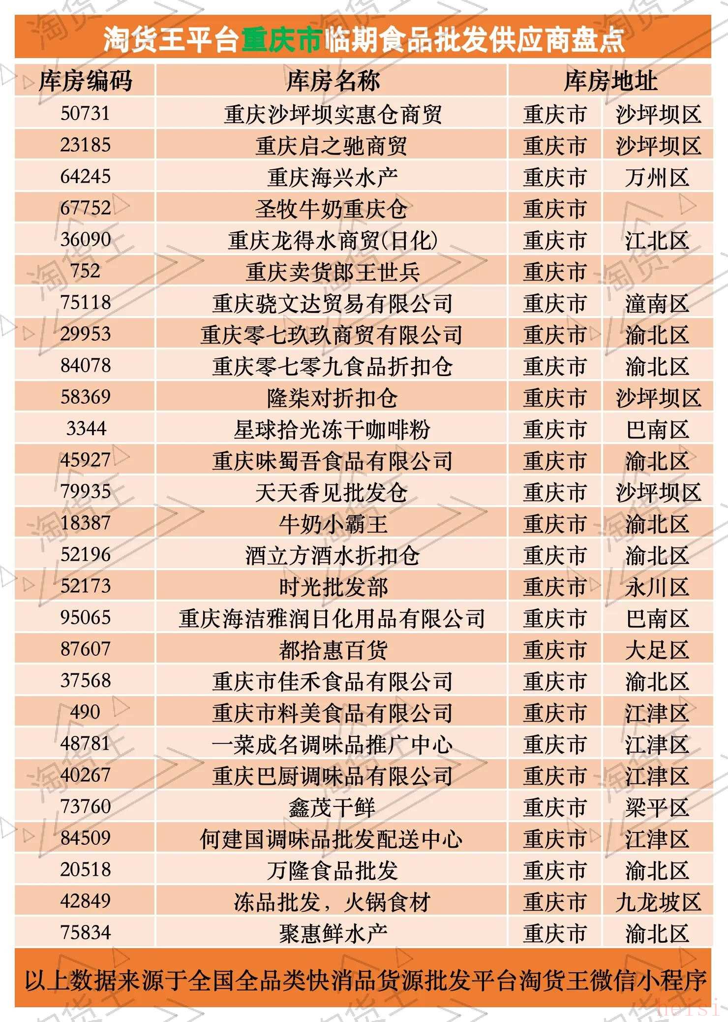目前重庆已经入驻到我们淘货王平台的供应商进货渠道有差不多30家左右,分布在重庆的各个区,如沙坪坝区、万州区、江北区、潼南区、渝北区、巴南区、永川区、大足区、江津区、梁平区、九龙坡区。