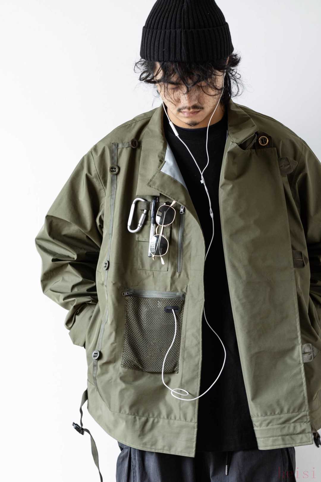 高山热店铺里人气最高的要属这款改良防水冲锋衣, 采用“DWR防泼水涂层+防水透气透湿薄膜+TRICOT网纱”3L面料,具备日常防风防雨功能。帽子可拆卸,通过YKK四合扣扣合,能实现“冲锋衣”与“高领夹克”的款式转变。
