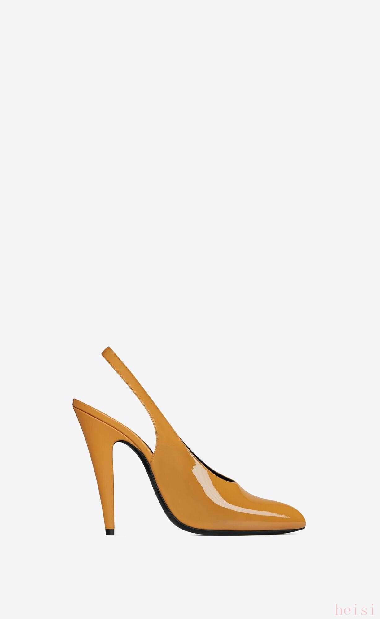 浅口高跟鞋,搭配包覆锥形细高跟和尖鞋头,点缀方形铭牌,很有职业女性风。