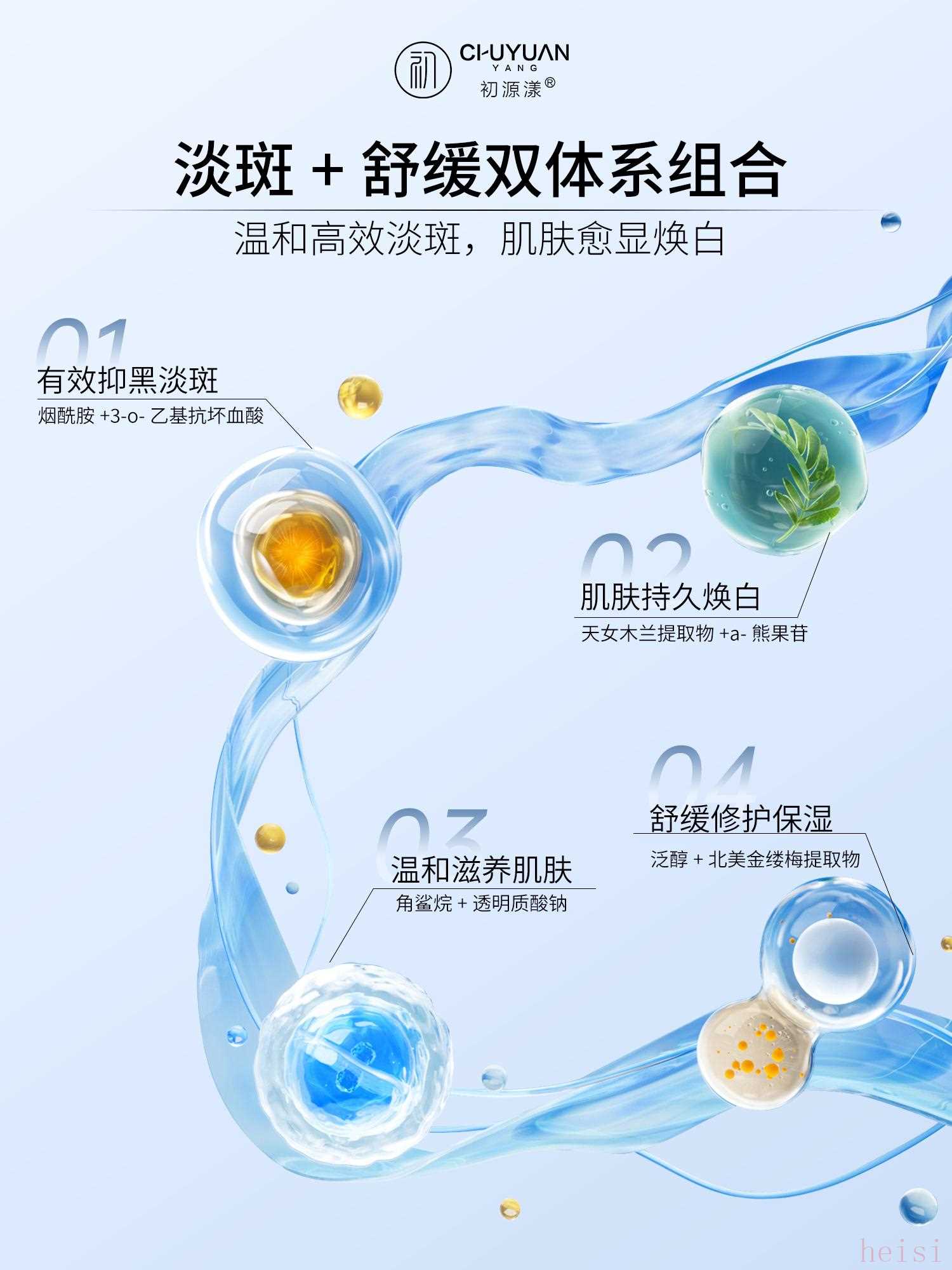接下来我们来了解一下这款产品的美白淡斑成分。其中含有烟酰胺、α-熊果苷、天女木兰提取物、透明维C等,它们可以从根源上干扰黑色素的形成过程。通过抑制酪氨酸酶的活性,有效地减少黑色素的产生,从而达到淡斑的目的。另外,还可以在黑色素还未大量生成之前就将其扼杀,同时它还有抗氧化的功效,能抵御自由基对肌肤的伤害。