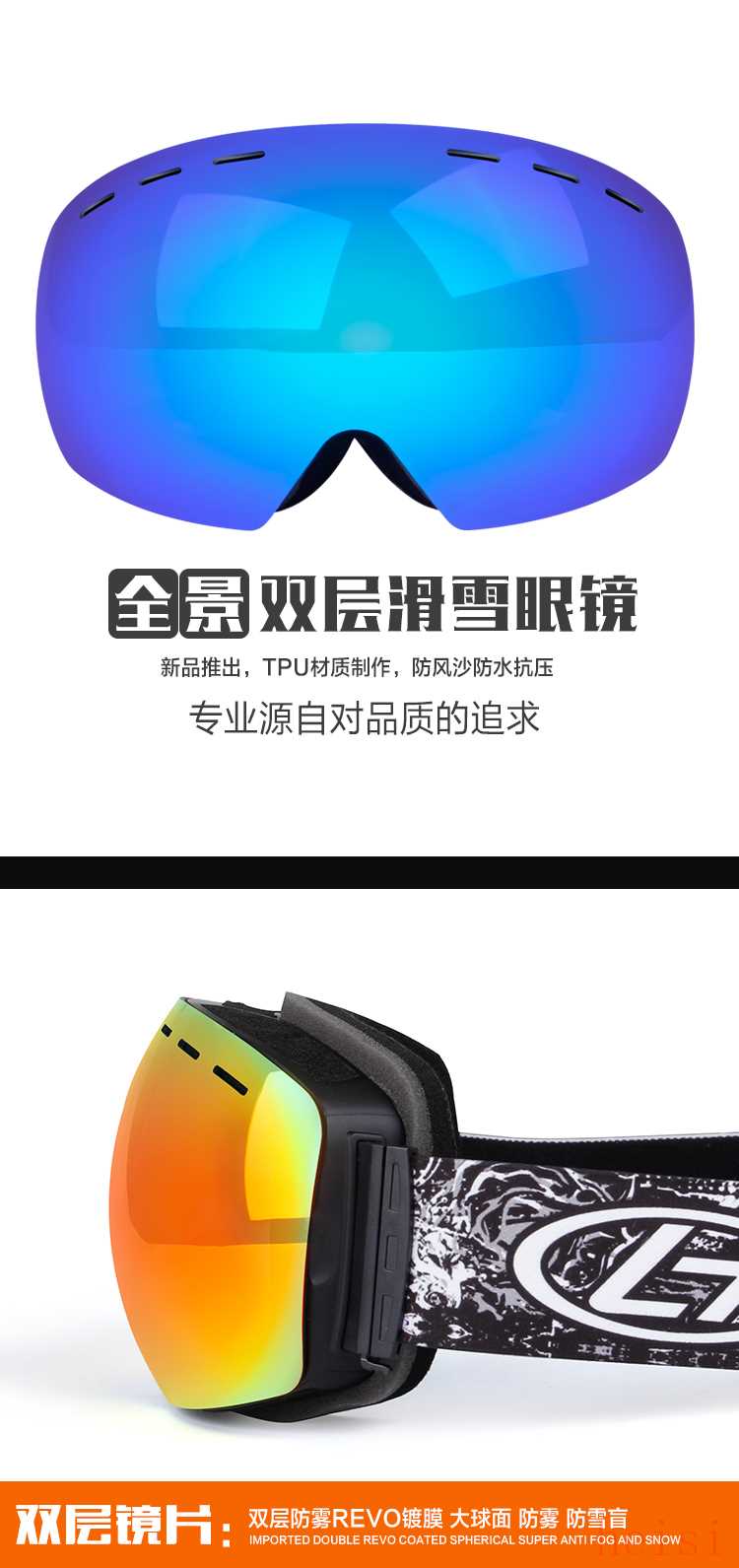 一般建议全景双层镜片的滑雪眼镜,材质建议使用TPU,防风防水抗压能力好。