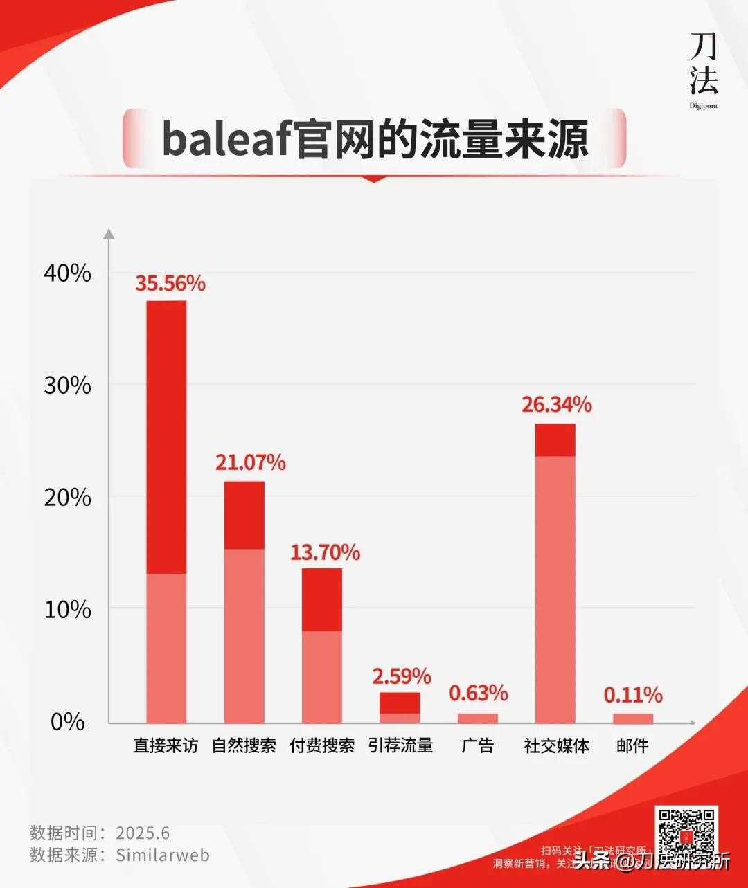 诚然,baleaf 要走的路还有很长,不过从数据来看,在官网流量来源占比中,直接来访目前占据了最高比例,达到 35.56%。