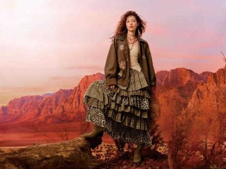 该系列如一册风格旅行手札,包含飘逸印花长裙、米白针织套装以及西部风格麂皮夹克。