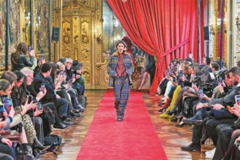 活动当天,于米兰历史地标克莱里奇宫的瑰丽穹顶下,秀场亮起璀璨灯光,丝绒的厚重质感与透明网纱的轻盈飘逸相互映衬,恰似阳光穿透云层倾洒而下,形成斑驳光影,模特们每一步都摇曳生姿,上演了一场极致奢华又满溢活力的视觉盛宴。