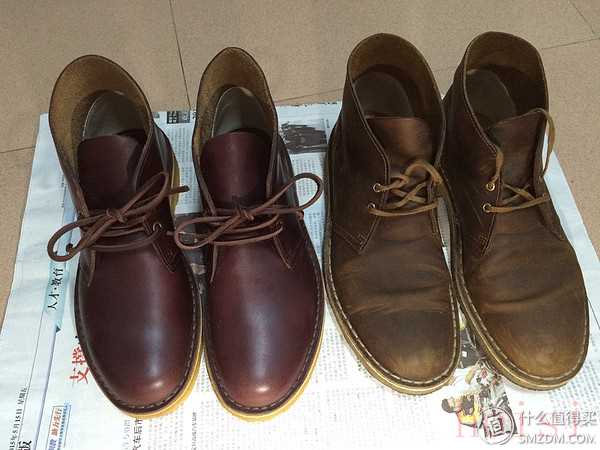 1、与蜜蜡色经典沙漠鞋比,Horween皮子要软很多,也要厚很多,做工上也好些,鞋面也略高,穿在脚上也不会立即出现折痕。从上图中也可以看出,蜜蜡色的没多久已经像旧鞋了!