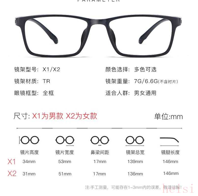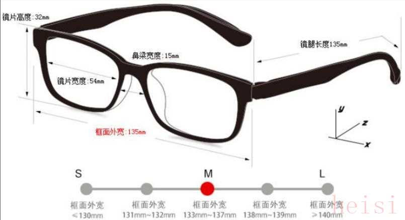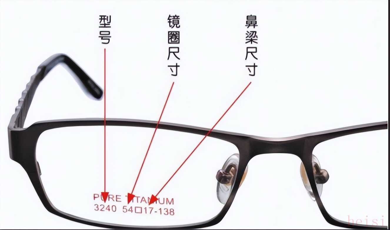 网上选购眼镜的时候, 也会标明镜架的尺寸, 方便选购。这个尺寸的眼镜就是:产品编号, 镜框尺寸52mm,梁宽度17mm,镜腿长度140mm, 纯钛金属镜架。