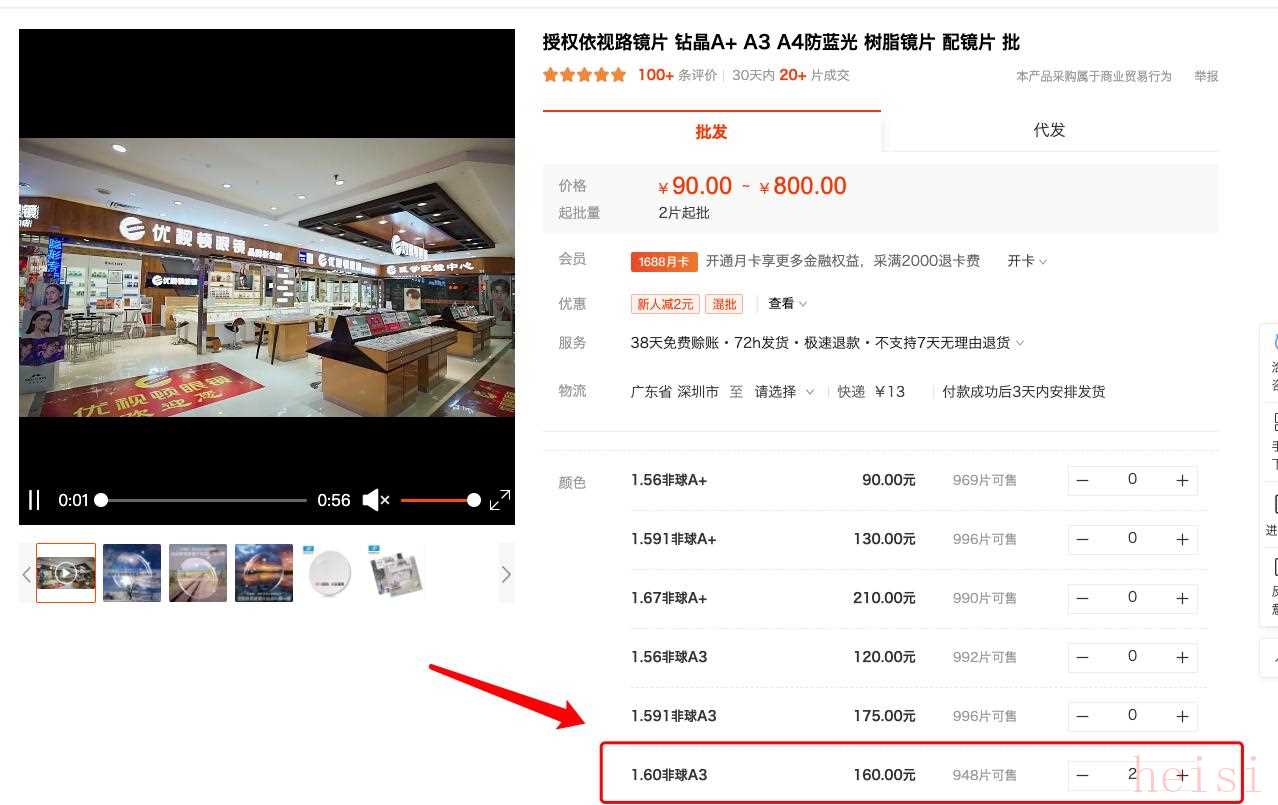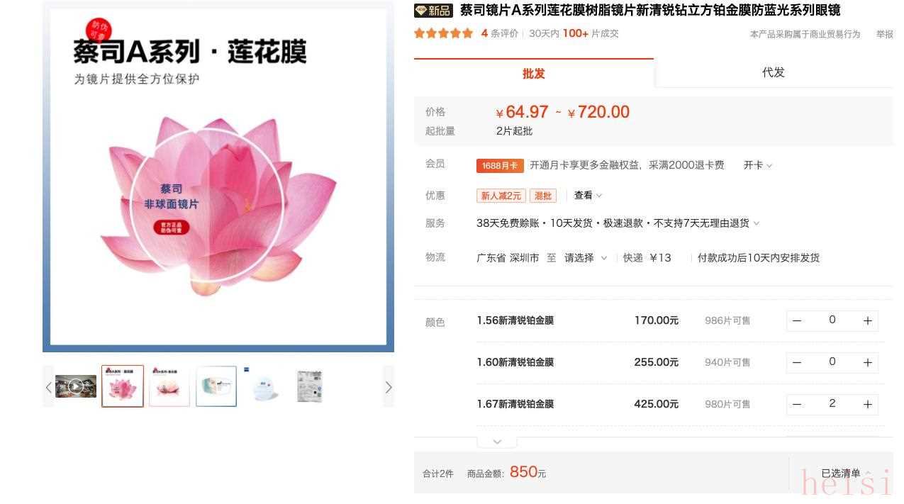 这里还可以打一个五折左右, 比如, 相同款式眼镜片在1688上面购买为320元一副两块。