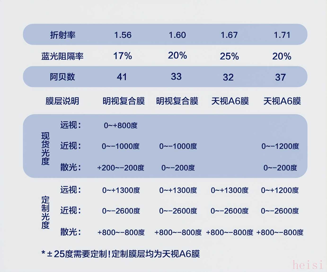 镜片通常就是看品牌, 材质, 球面和非球面, 折射率, 色散系数, 防蓝光等等。最简单看品牌