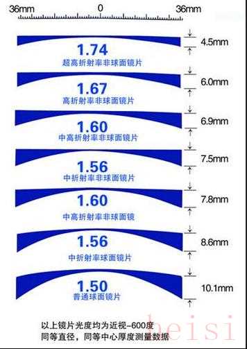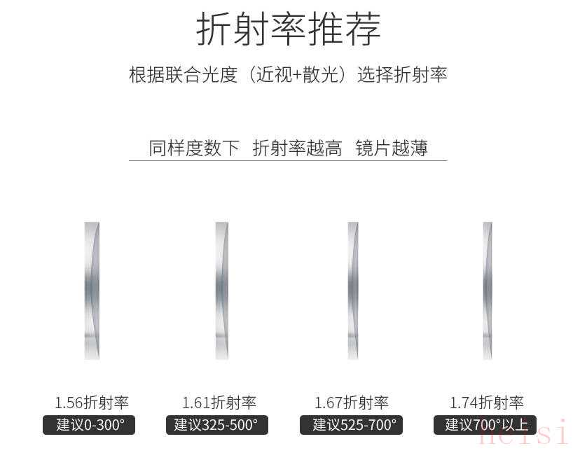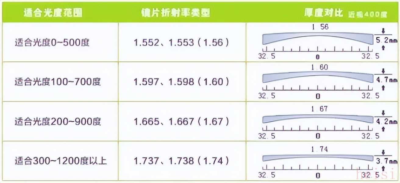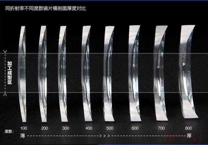如下可以看到度数和折射率是一个正比关系, 度数越高镜片越厚。 如果需要轻薄一点就可以选择折射率高的镜片, 同样这样价格就会稍微高一点。