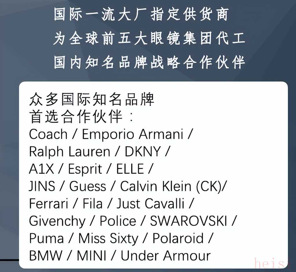 这个工厂店铺, 以大批量定制为主, 但确实是一家巨型眼镜企业。 众多著名眼镜品牌代工厂, 比如派丽蒙, 高特, JINS, Police, 也是很多奢侈品品牌的合作工厂, 比如 Givenchy/Cavalli/Coach/ Emporio Armani/ Ralph Lauren/DKNY/ CK等等。