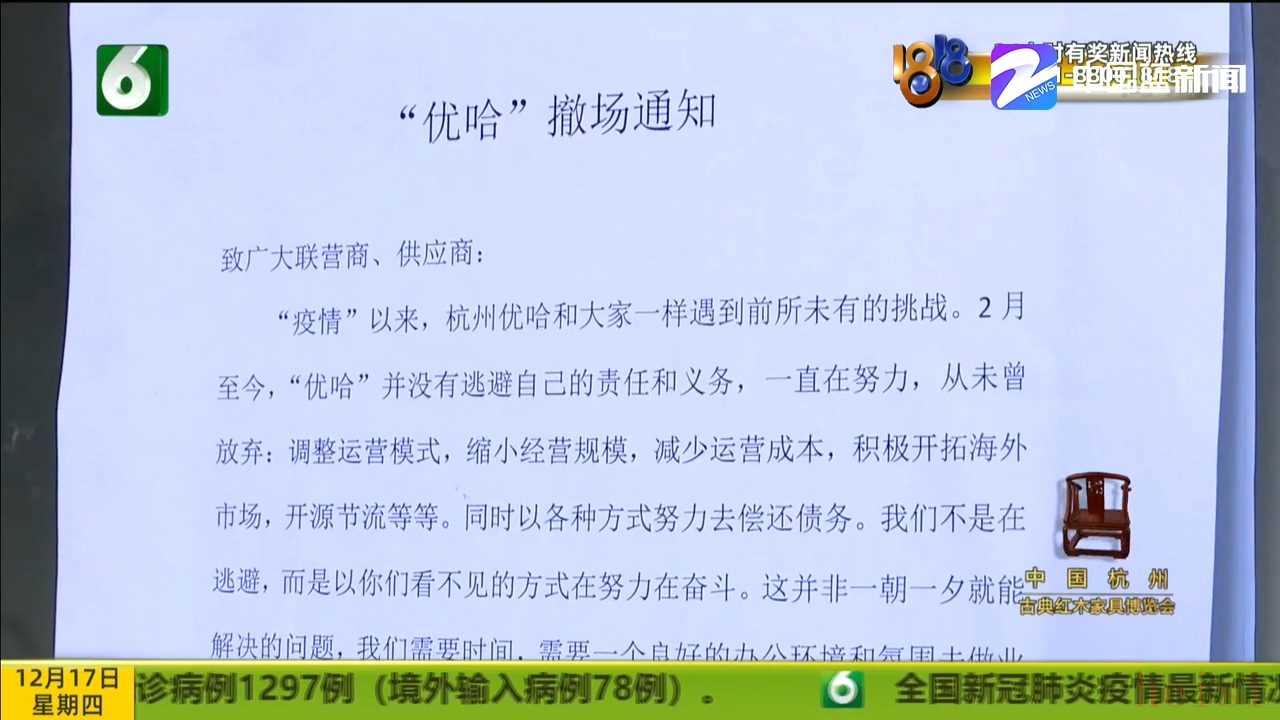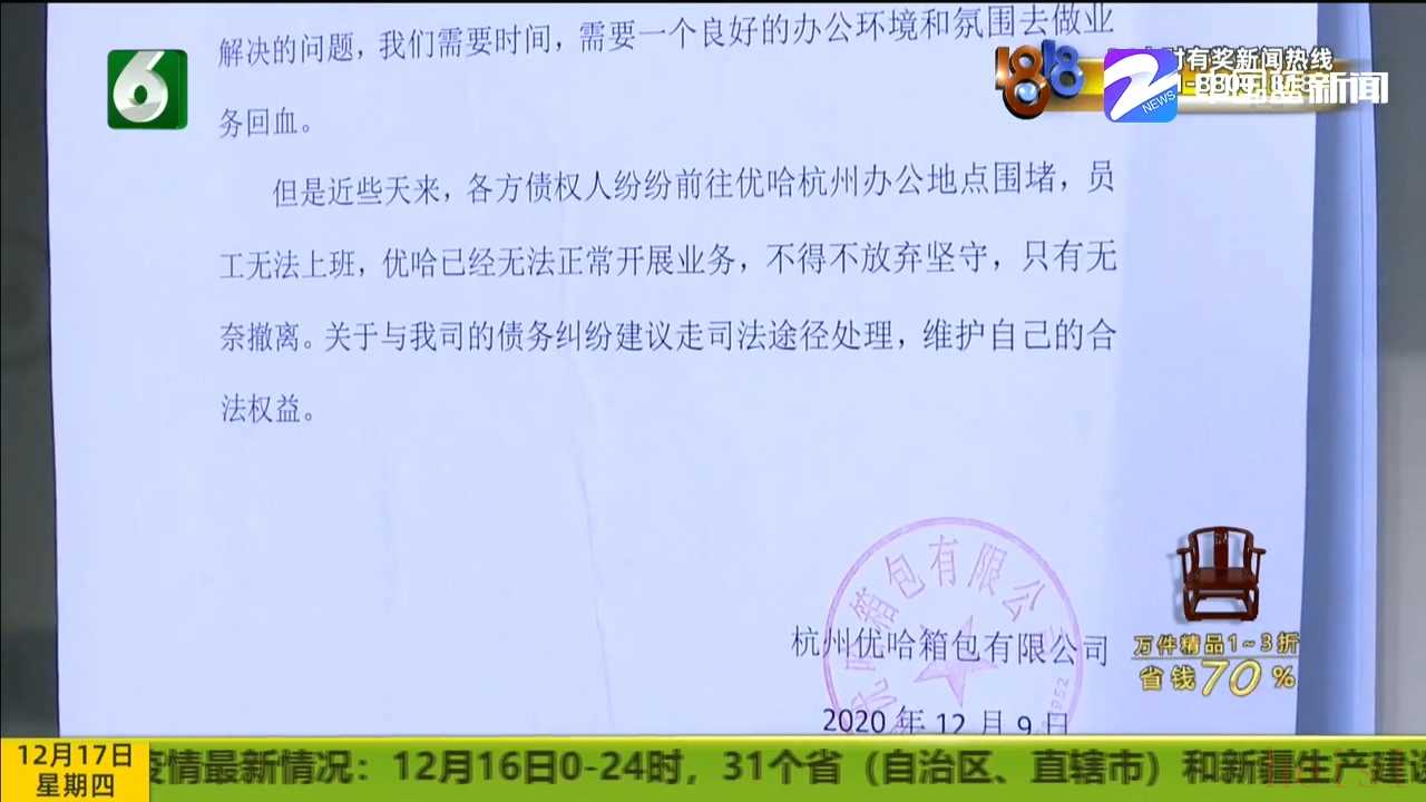 杭州优哈箱包有限公司的办公地址在下城区华丰路,记者赶过去发现这里除了一些垃圾都被搬空了,玻璃门上贴着一份悠哈撤场通知,通知的大概内容是各方债权人到办公地点围堵,优哈只有无奈撤离。关于债务纠纷优化建议,联营商和供应商通过司法途径解决,这份通知的日期是12月9号。