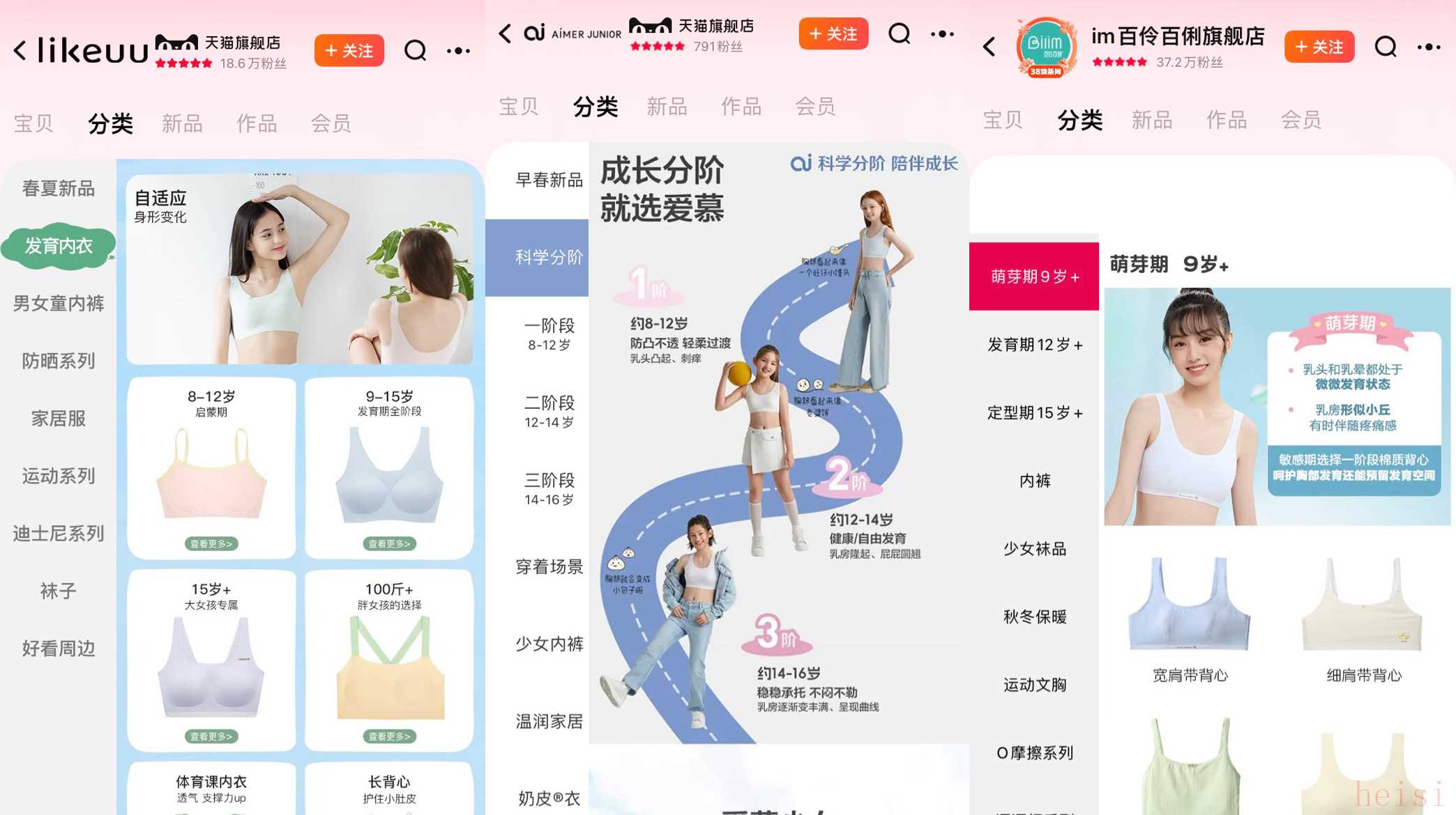 以likeuu为例,它将发育期内衣分为适合8-12岁、9-15岁和15岁+的三类,另外还为大体重女孩、体育课等特定人群和场景设计了内衣。
