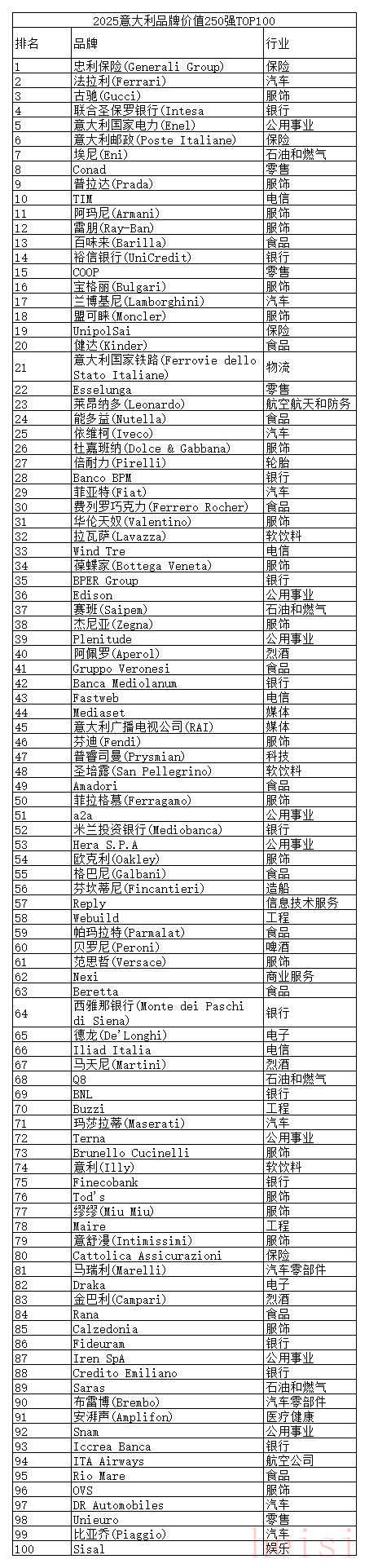 作为发达工业国,石油化工、汽车制造、航空航天、纺织服装是其支柱产业,诞生出许多知名汽车、奢侈品品牌。下面结合权威品牌评估机构Brand Finance发布的“2025意大利品牌价值100强”榜单(Italy 100 2025),简单作一下介绍。【注:Brand Finance使用特许费率法计算出品牌价值,即许可人在开放市场通过品牌授权可获得的净经济利益】