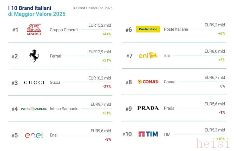 2. "领先法拉利和古驰":法拉利和古驰都是意大利的知名品牌,分别以高端汽车和时尚产品闻名。尽管它们在各自的领域内非常成功,但在2025年的品牌价值排名中,有另一个意大利品牌超过了它们。这可能意味着该品牌在多个方面表现优异,如财务增长、技术创新、全球市场扩张等。