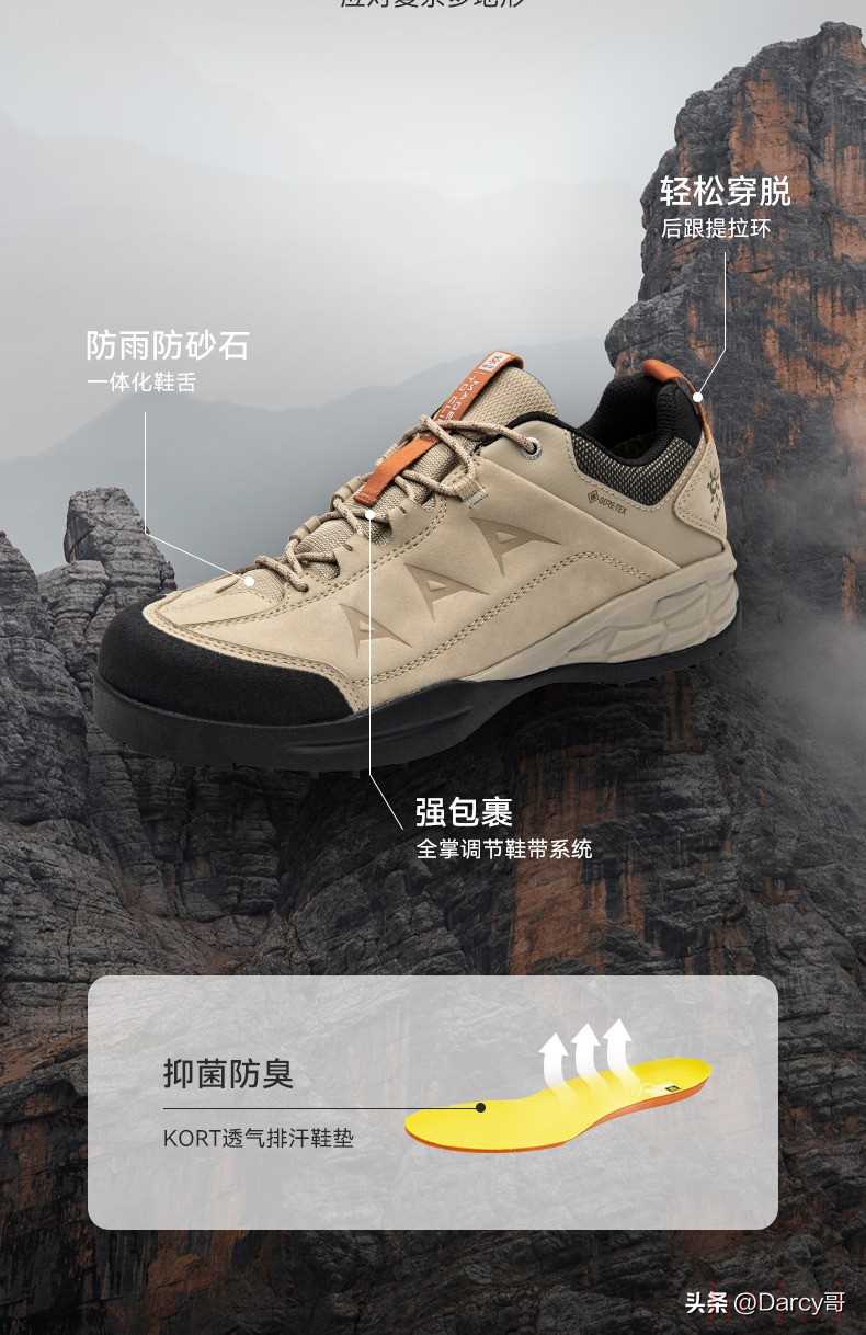 该款登山鞋采用牛巴戈真皮覆盖包裹,是野性的防护力与重装徒步的碰撞交融。这款徒步鞋集防滑耐滑,中底稳定支撑,全掌包裹调节以及GORE-TEX防水透气耐磨于一身。可应对绝大多数气候多变、地形复杂的路线挑战、更适合中长线重装徒步和5000米入门级雪山攀登。2、凯乐石GTX防水登山鞋KS2142304