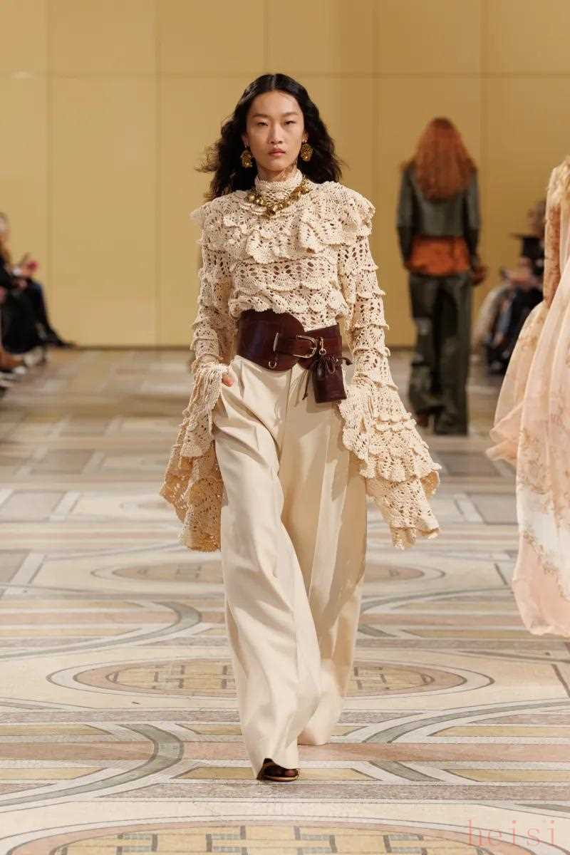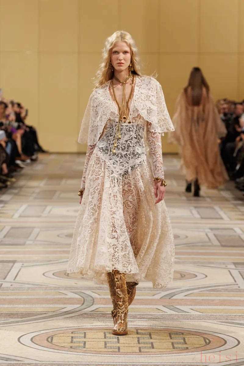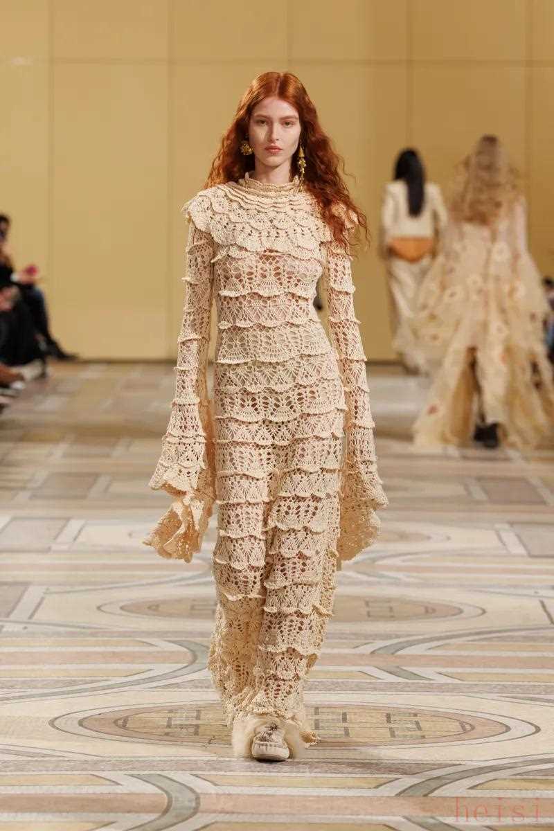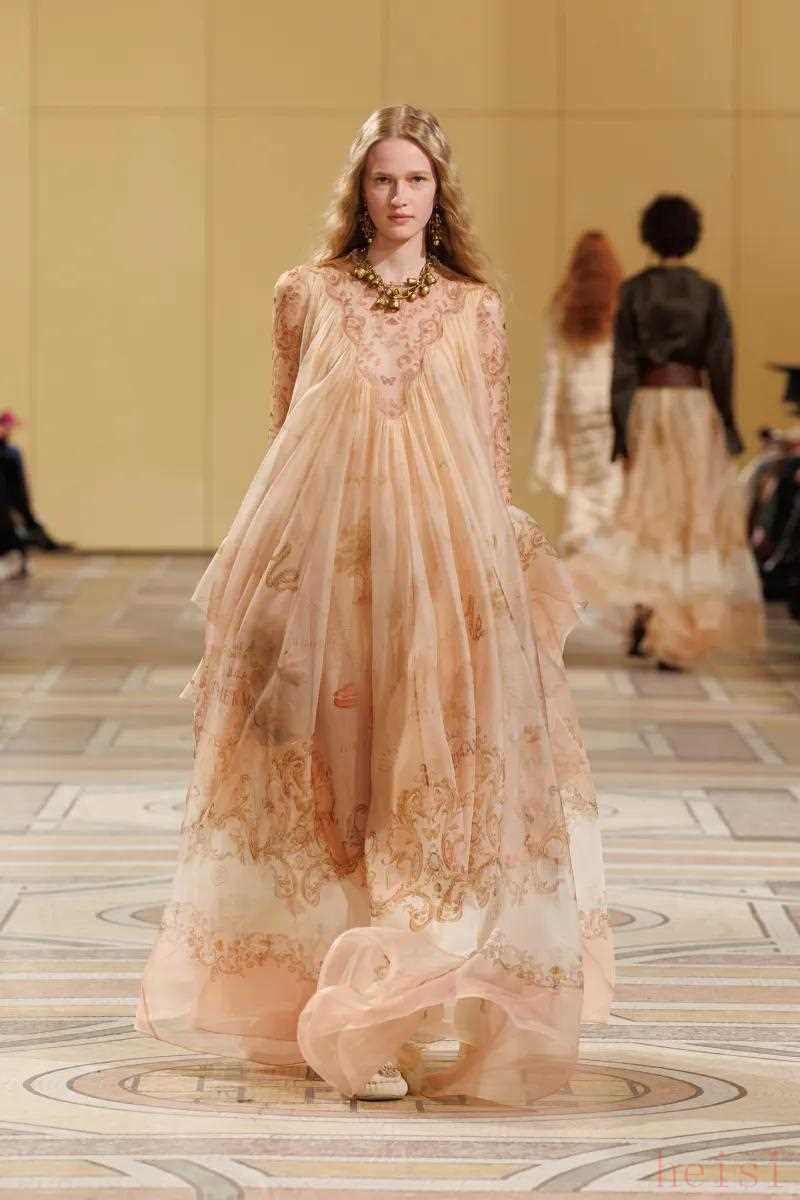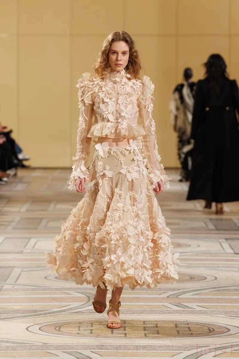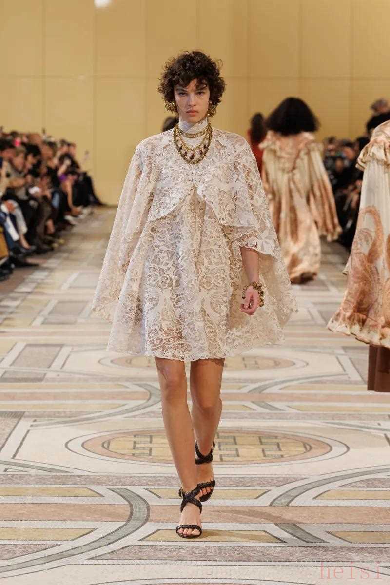压轴造型是一袭奶油色雪纺叠层裙装,裙身上绣有复古情人节卡片图案,成为Zimmermann每季标志性的浪漫符号。而叠层设计则通过手工编织细节,模拟出与风的形态。当模特提着裙摆转身时,观众席爆发出掌声——这一造型完美复现了电影开场中“空灵基调和悬疑氛围”的平衡。