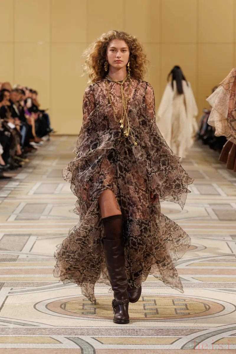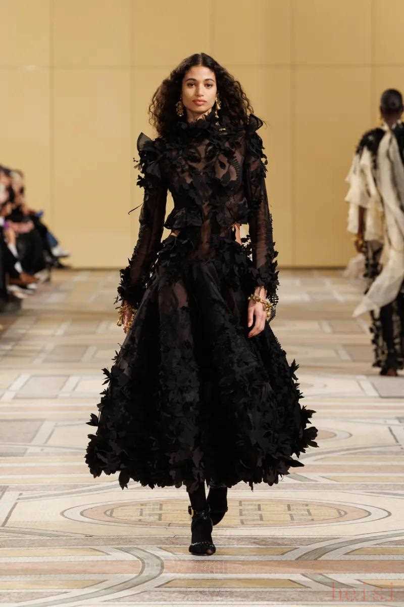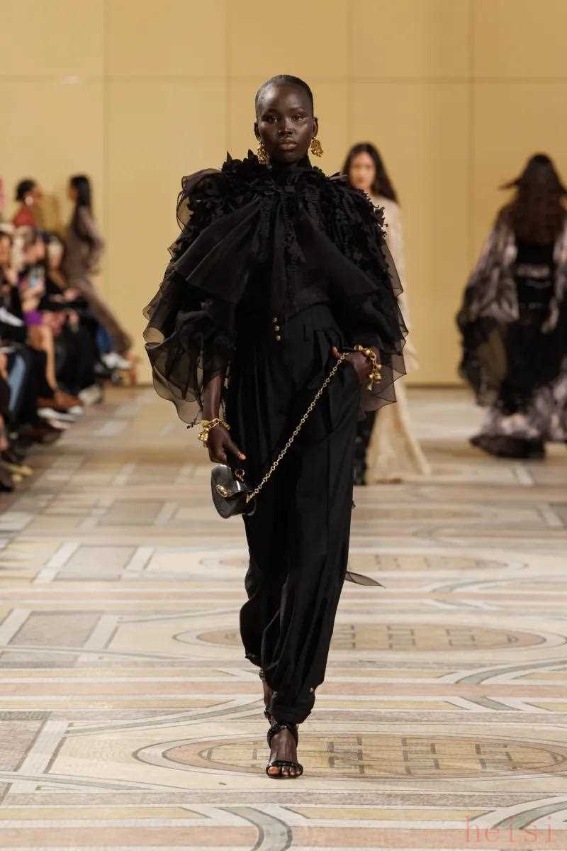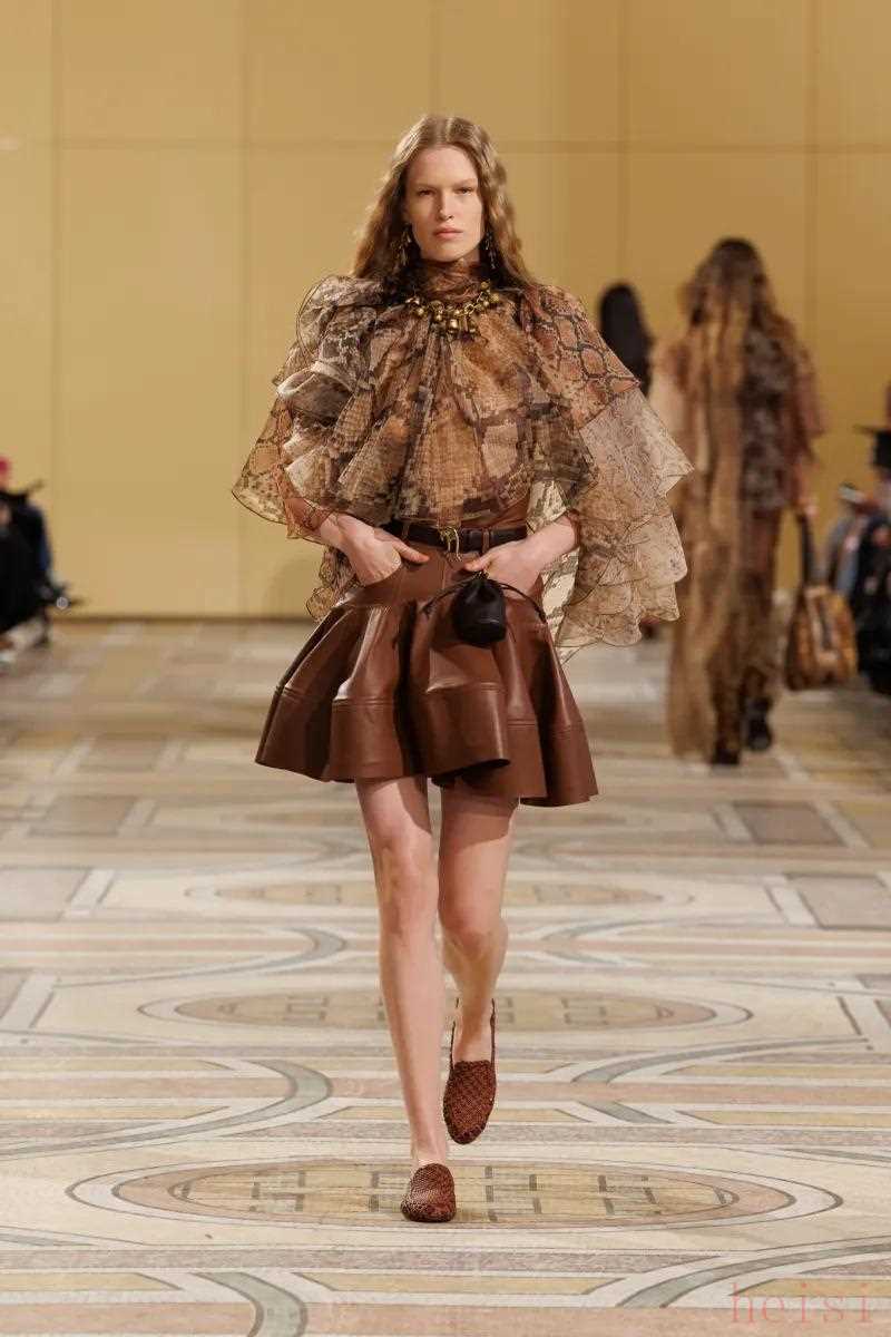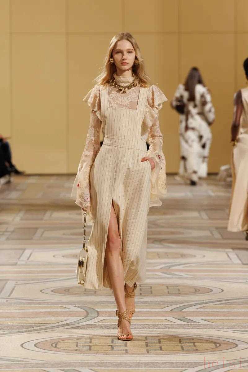 压轴造型是一袭奶油色雪纺叠层裙装,裙身上绣有复古情人节卡片图案,成为Zimmermann每季标志性的浪漫符号。而叠层设计则通过手工编织细节,模拟出与风的形态。当模特提着裙摆转身时,观众席爆发出掌声——这一造型完美复现了电影开场中“空灵基调和悬疑氛围”的平衡。