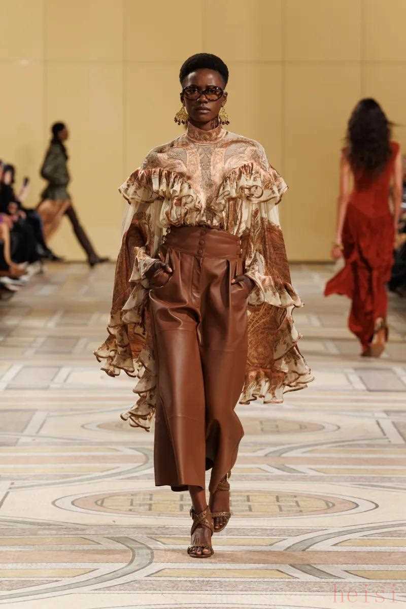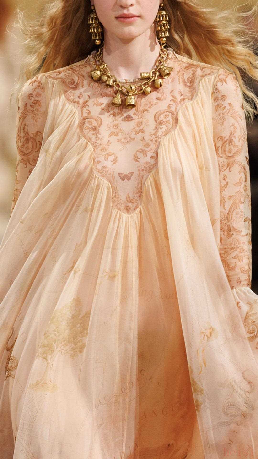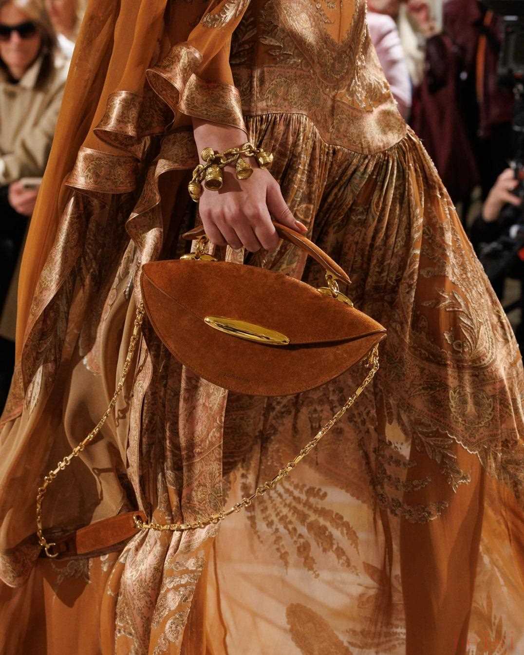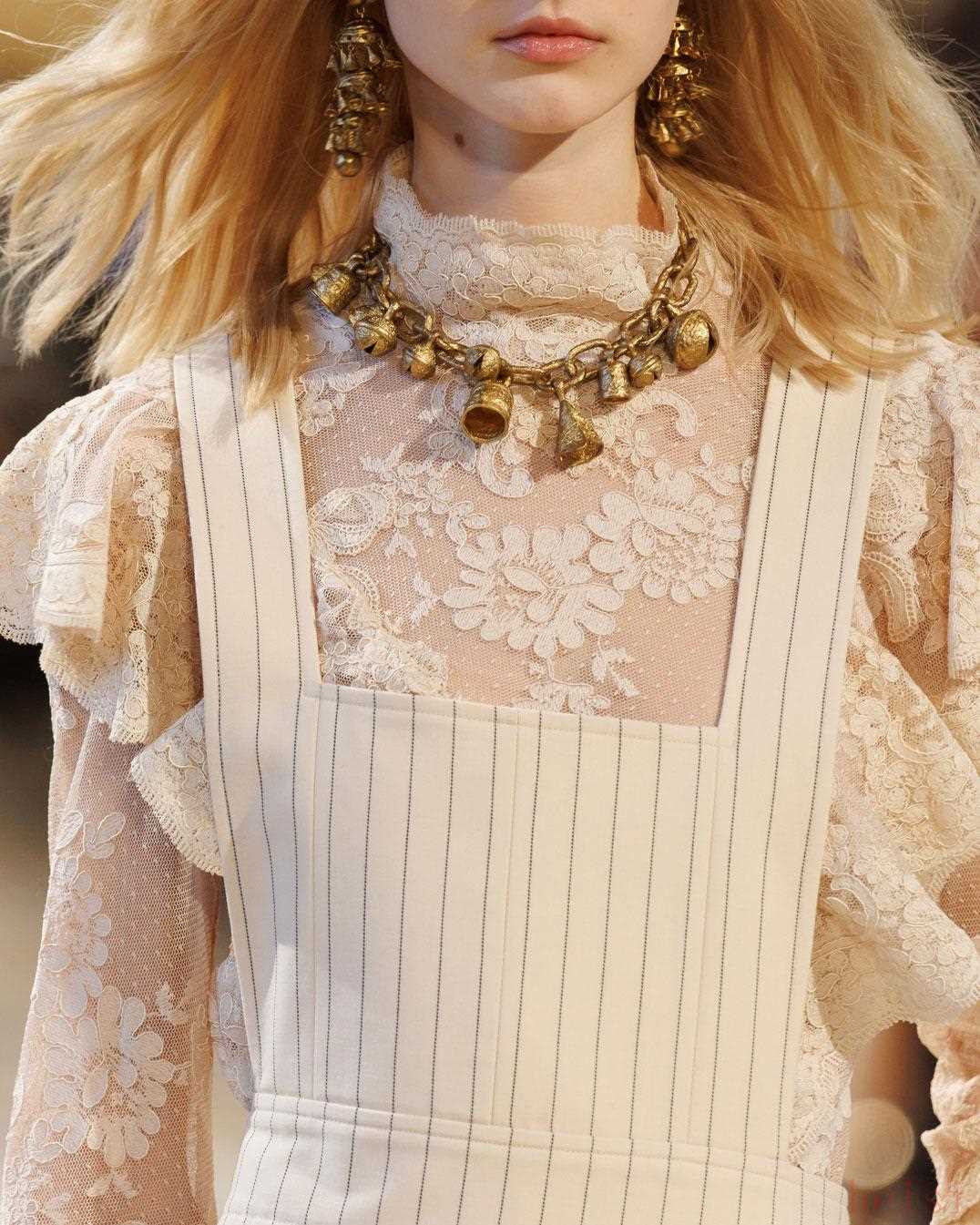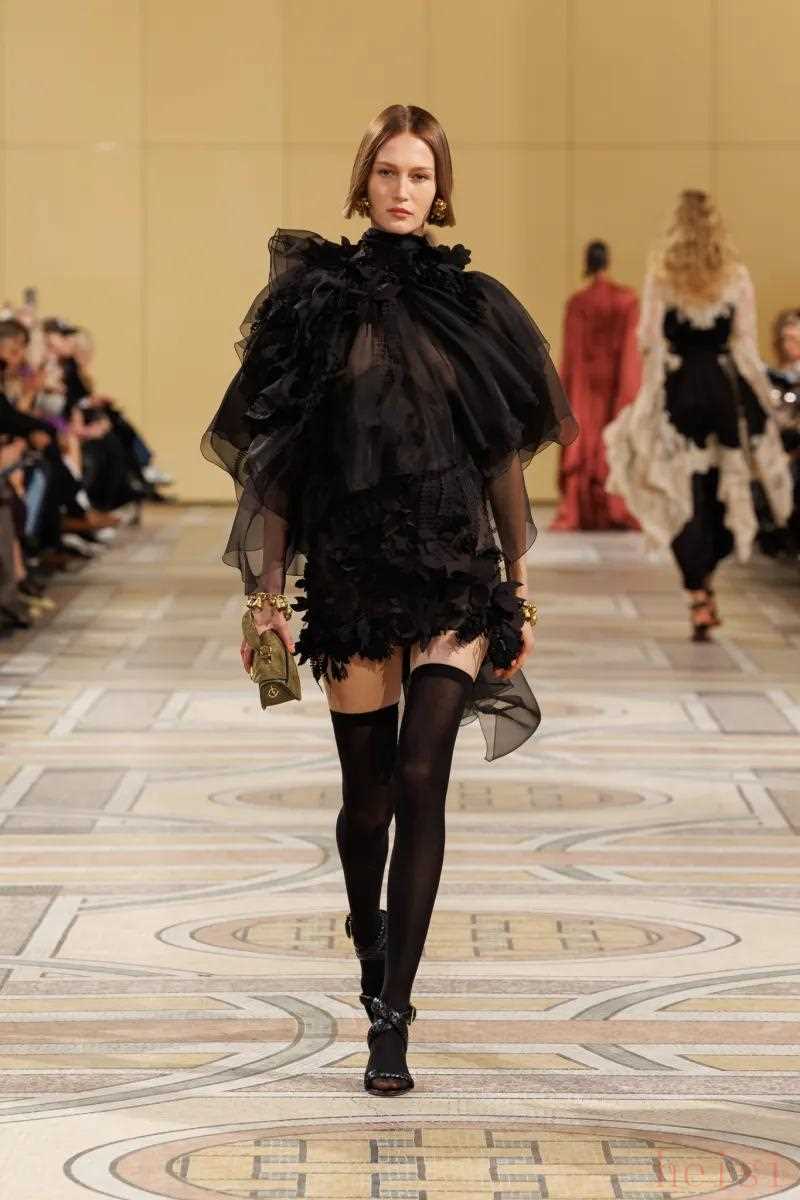 压轴造型是一袭奶油色雪纺叠层裙装,裙身上绣有复古情人节卡片图案,成为Zimmermann每季标志性的浪漫符号。而叠层设计则通过手工编织细节,模拟出与风的形态。当模特提着裙摆转身时,观众席爆发出掌声——这一造型完美复现了电影开场中“空灵基调和悬疑氛围”的平衡。