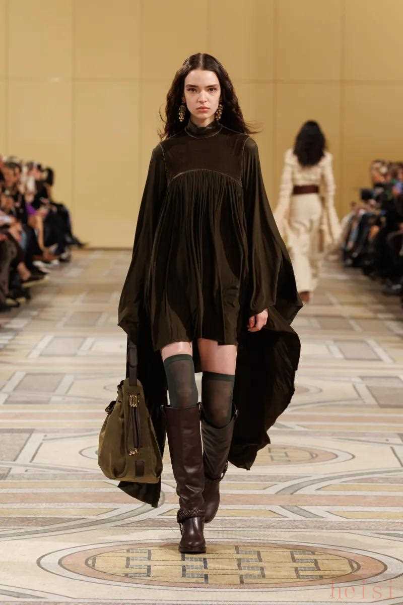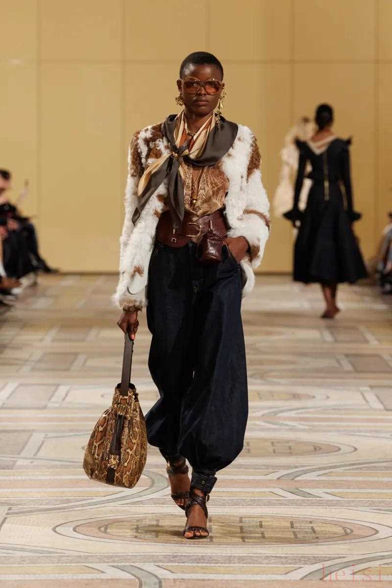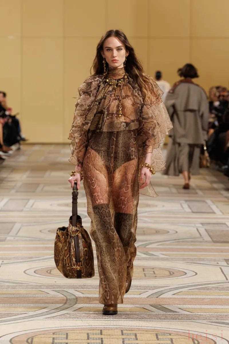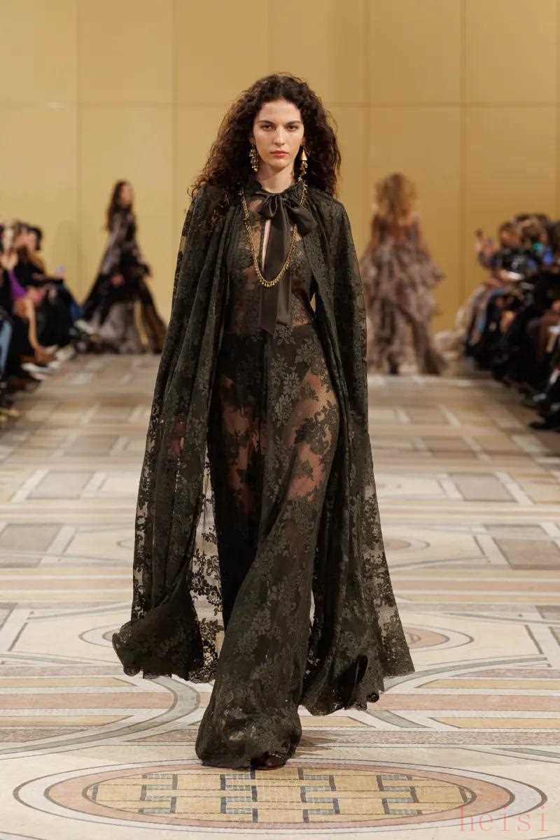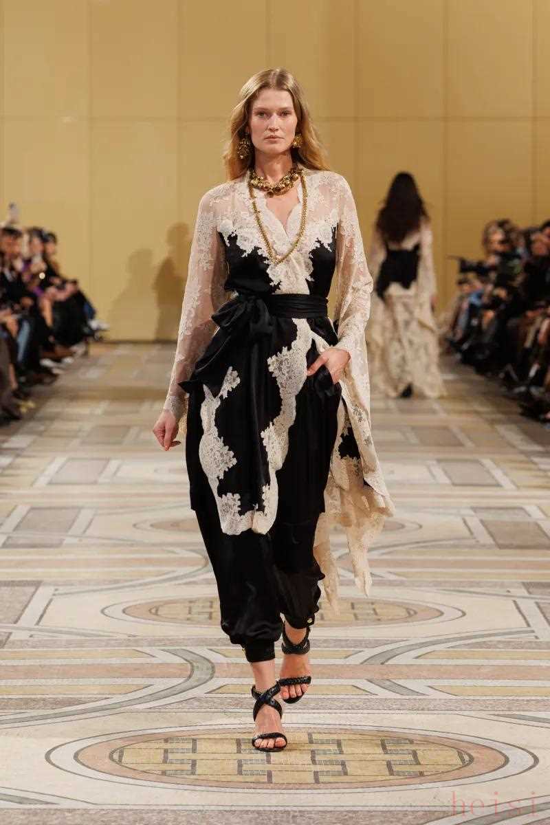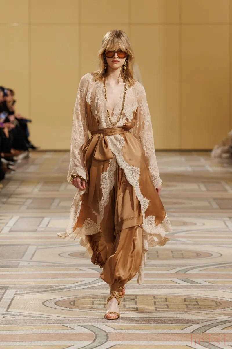 开场造型中,模特身着缎面睡袍缓缓步入T台,睡袍的流动感与垂坠裙摆形成对比,微露肌肤的短裁披肩式上装搭配颈饰,勾勒出若隐若现的柔美曲线。这一设计灵感源自电影中女校生在荒野失踪前的静谧时刻,缎面如第二层肌肤般贴合身体,而铃袖细节,则暗喻着少女心事的透光性。
