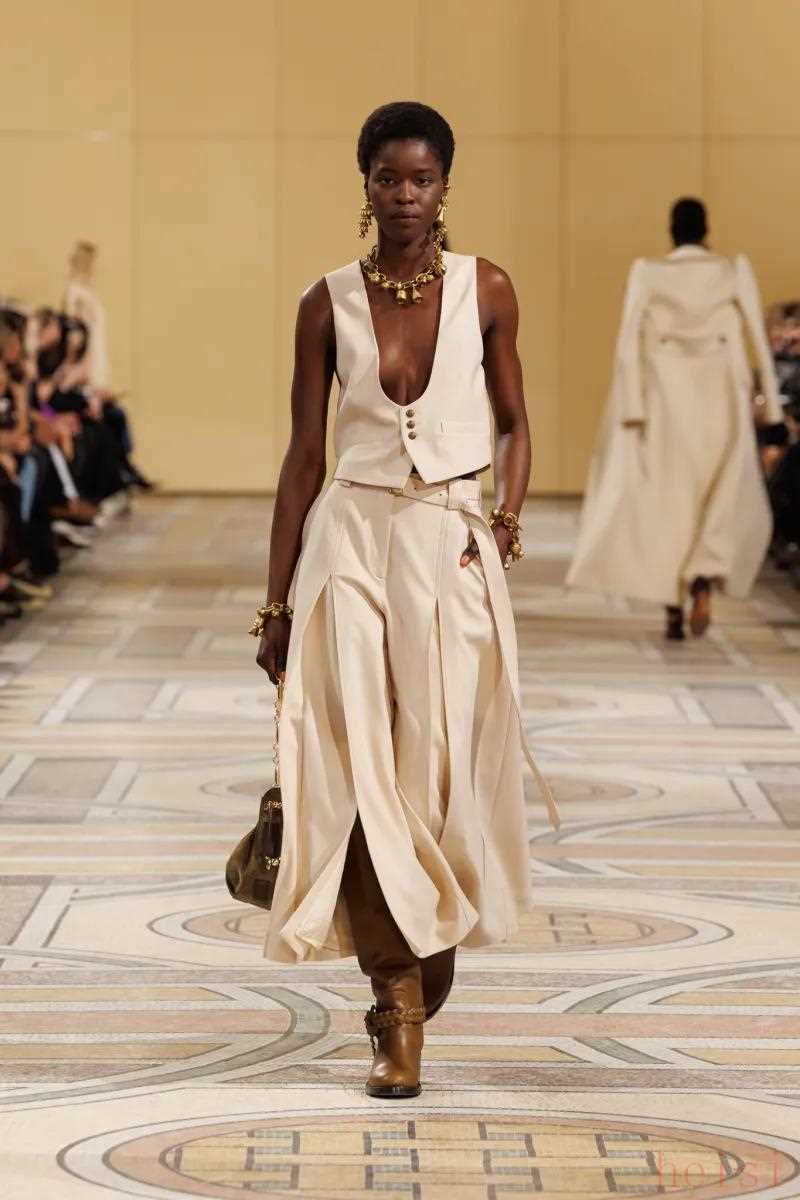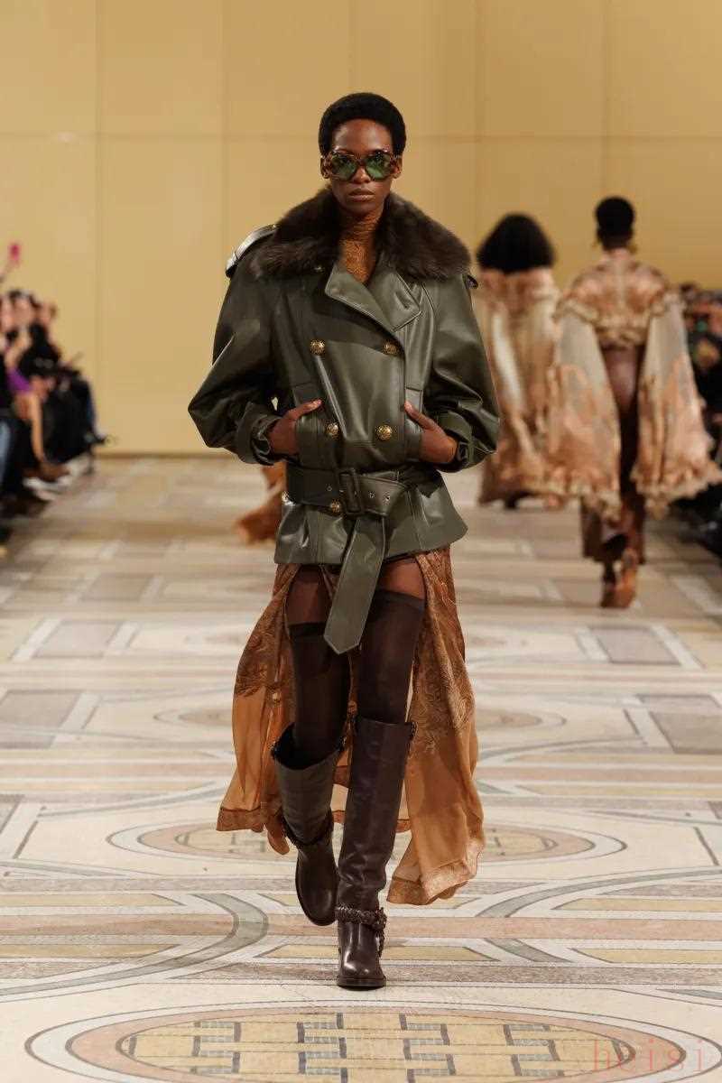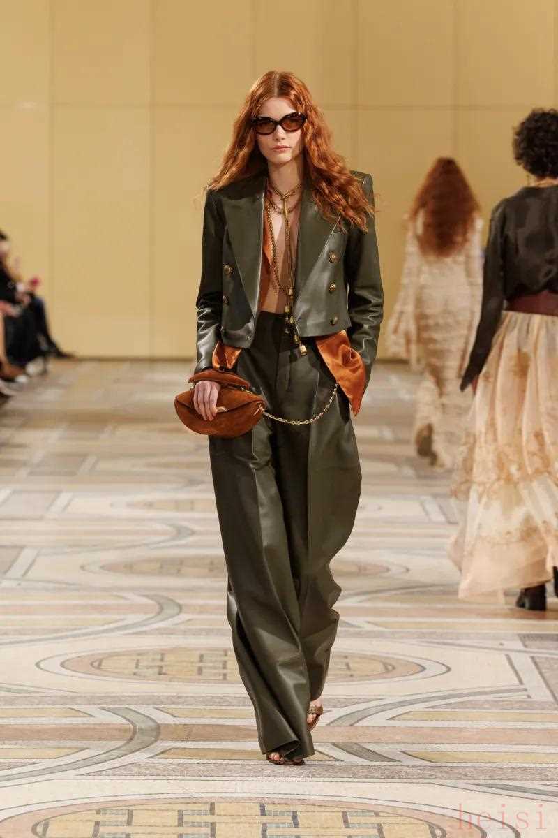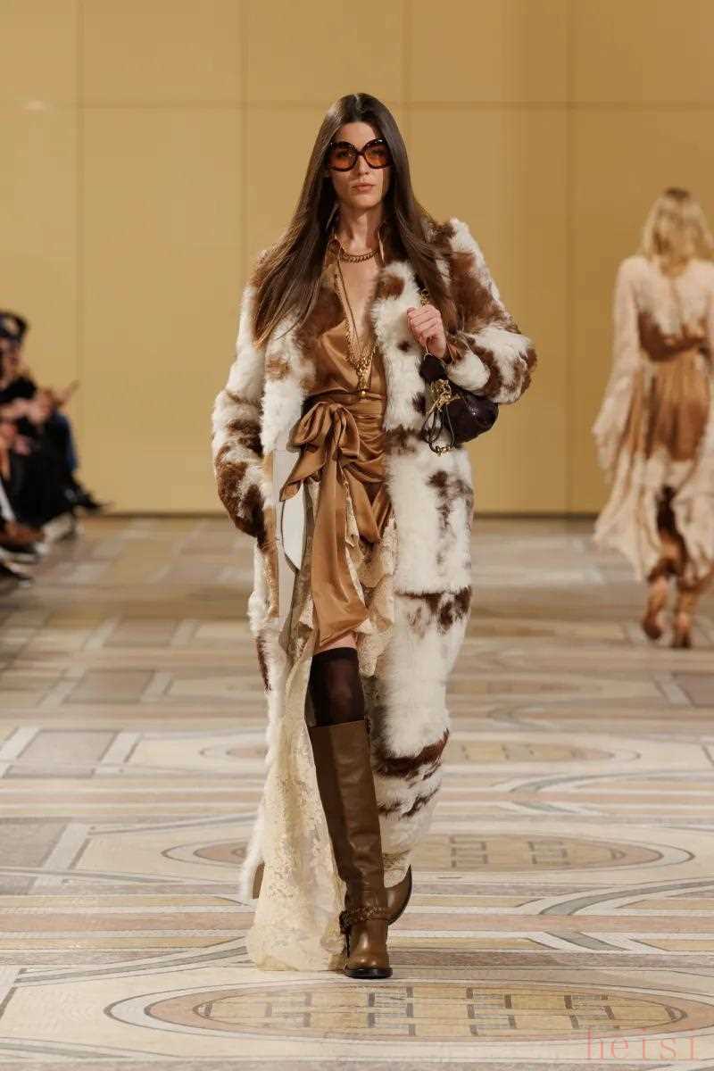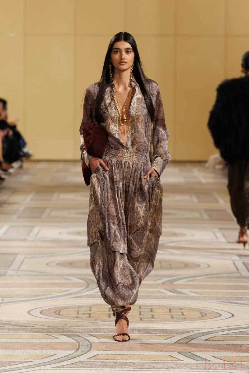 开场造型中,模特身着缎面睡袍缓缓步入T台,睡袍的流动感与垂坠裙摆形成对比,微露肌肤的短裁披肩式上装搭配颈饰,勾勒出若隐若现的柔美曲线。这一设计灵感源自电影中女校生在荒野失踪前的静谧时刻,缎面如第二层肌肤般贴合身体,而铃袖细节,则暗喻着少女心事的透光性。
