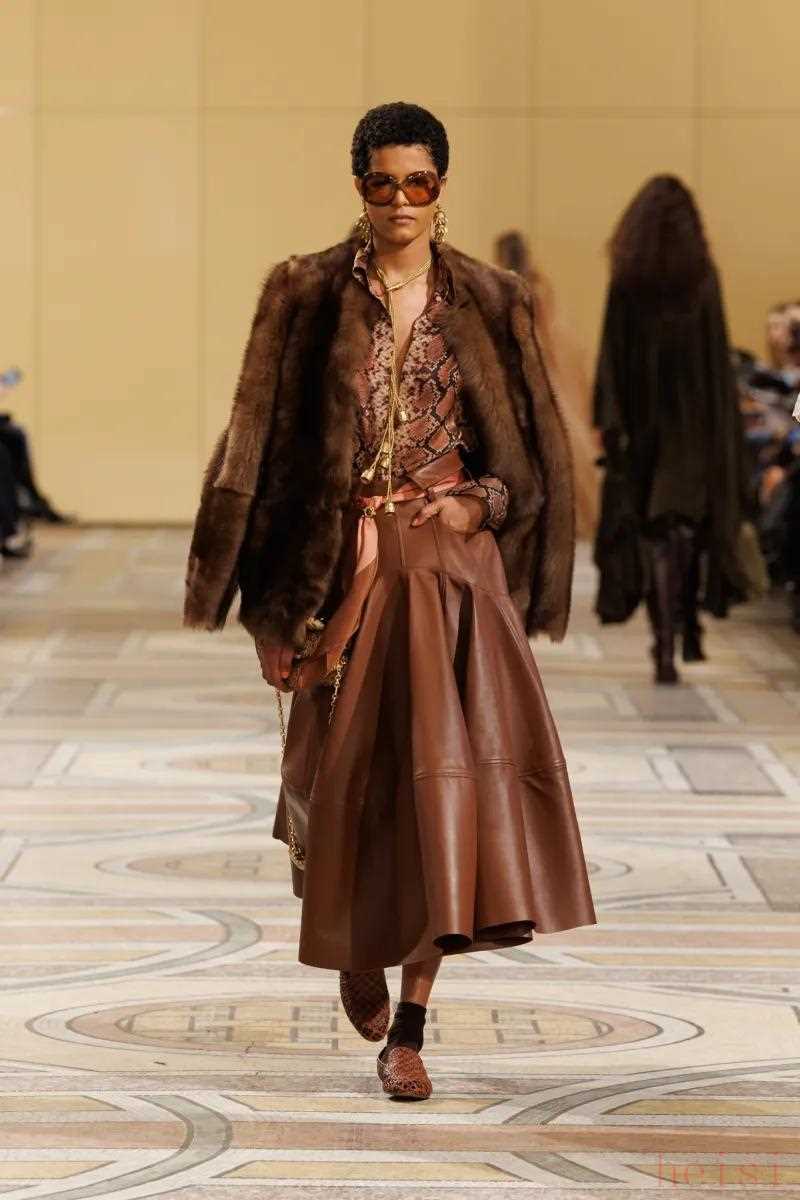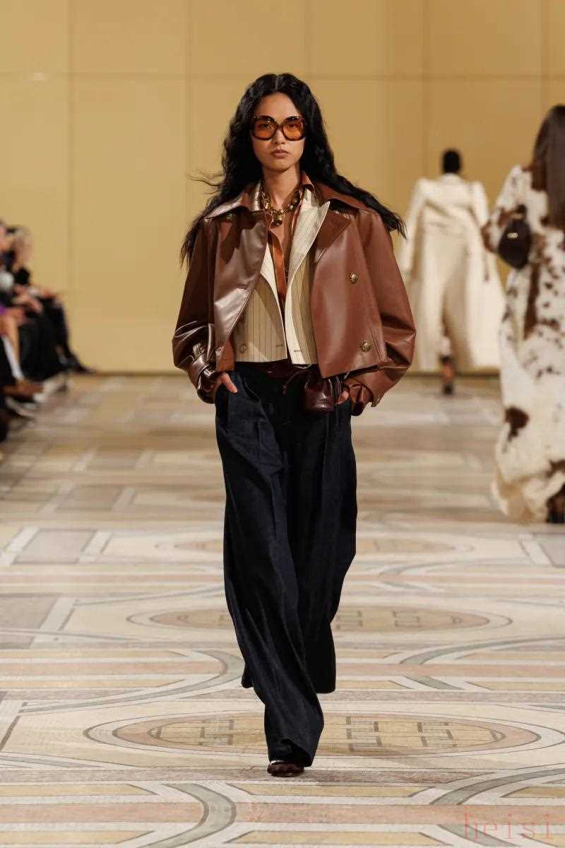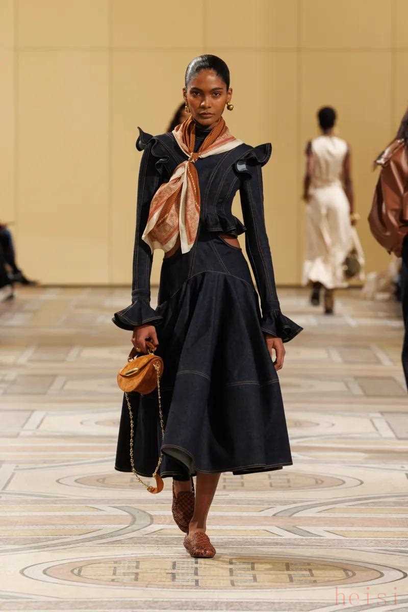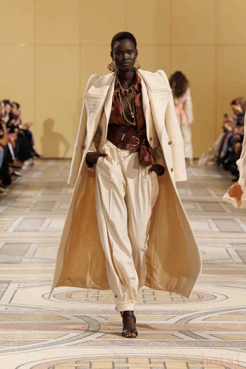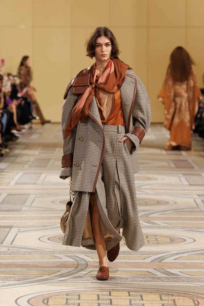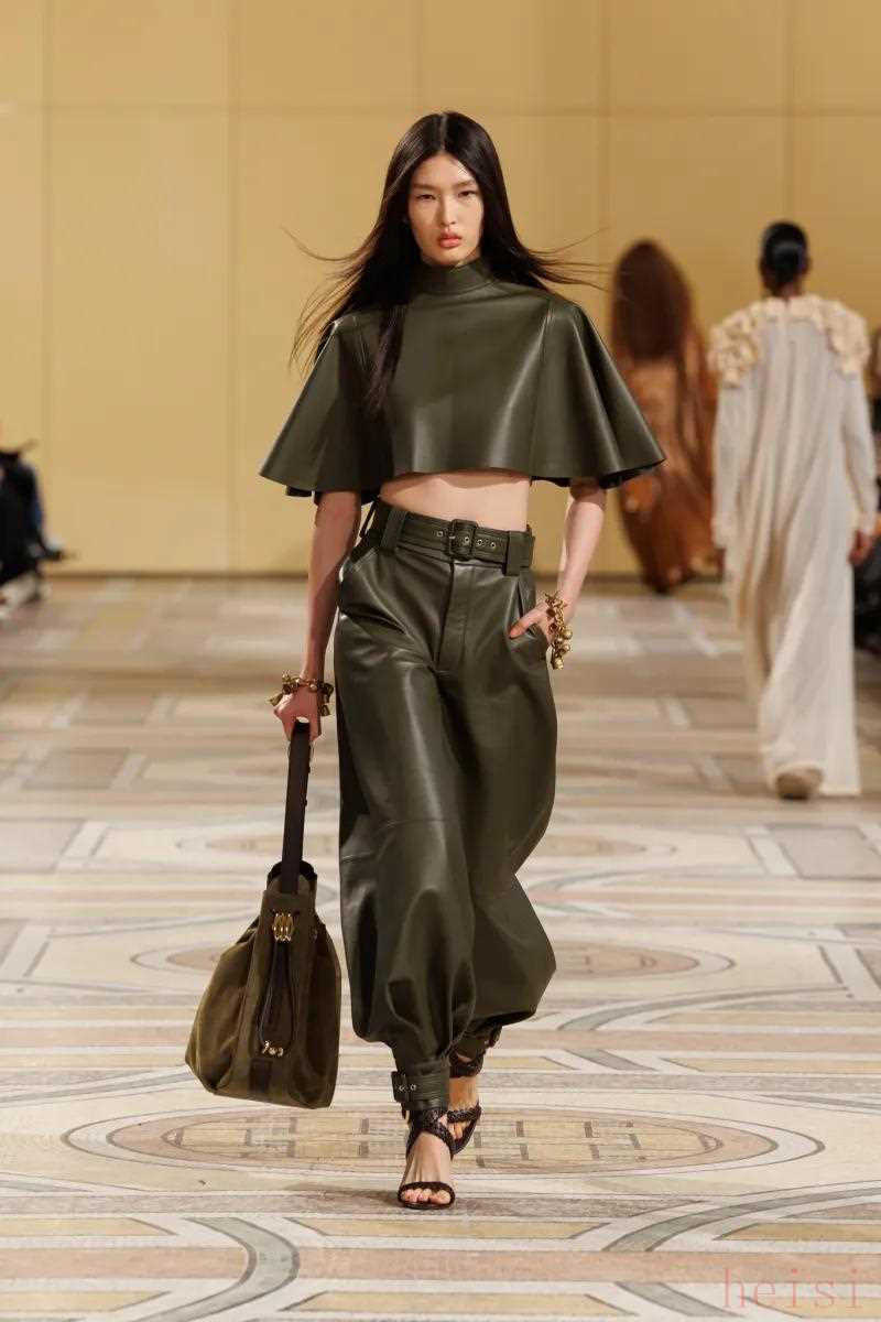 开场造型中,模特身着缎面睡袍缓缓步入T台,睡袍的流动感与垂坠裙摆形成对比,微露肌肤的短裁披肩式上装搭配颈饰,勾勒出若隐若现的柔美曲线。这一设计灵感源自电影中女校生在荒野失踪前的静谧时刻,缎面如第二层肌肤般贴合身体,而铃袖细节,则暗喻着少女心事的透光性。