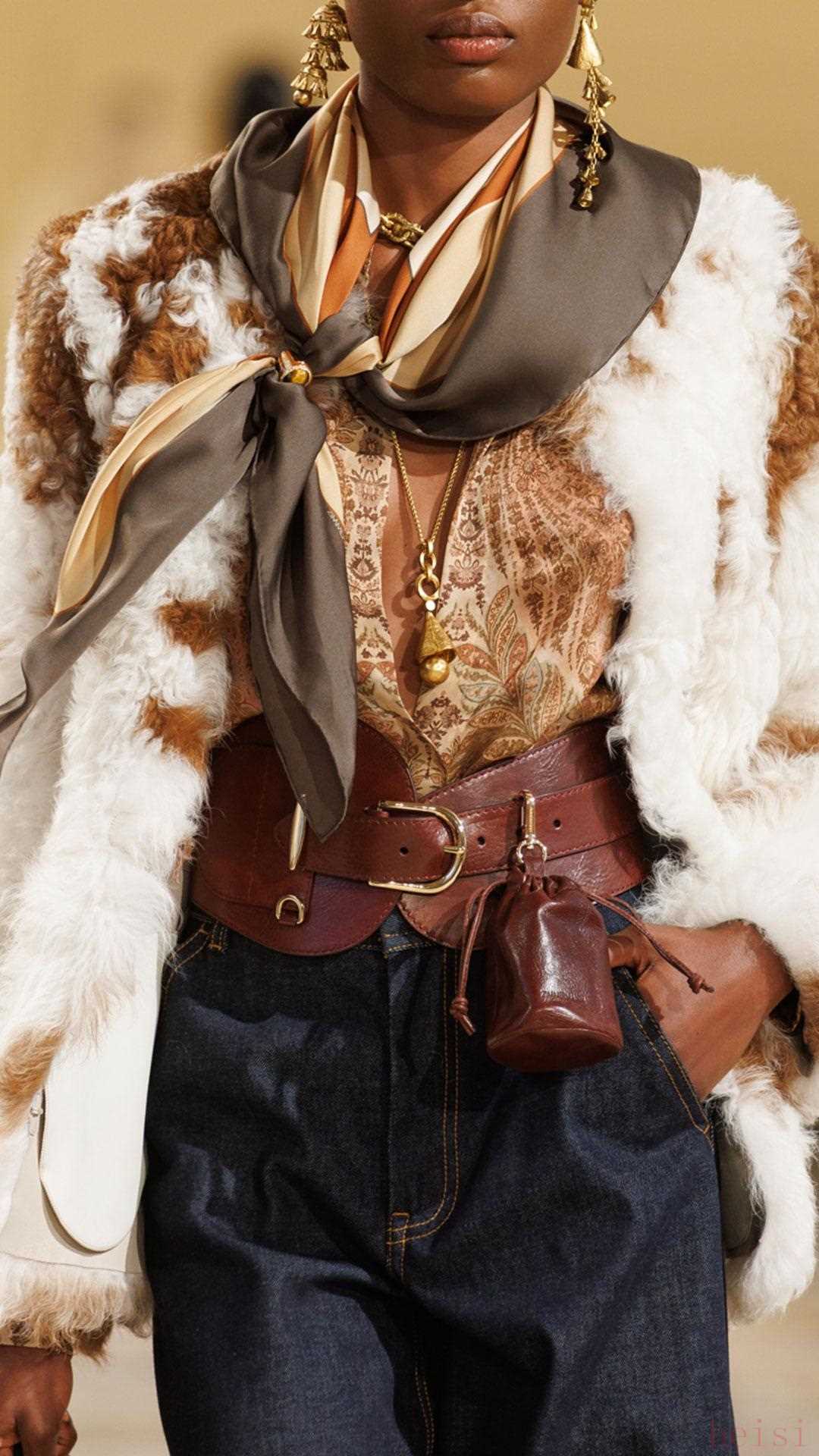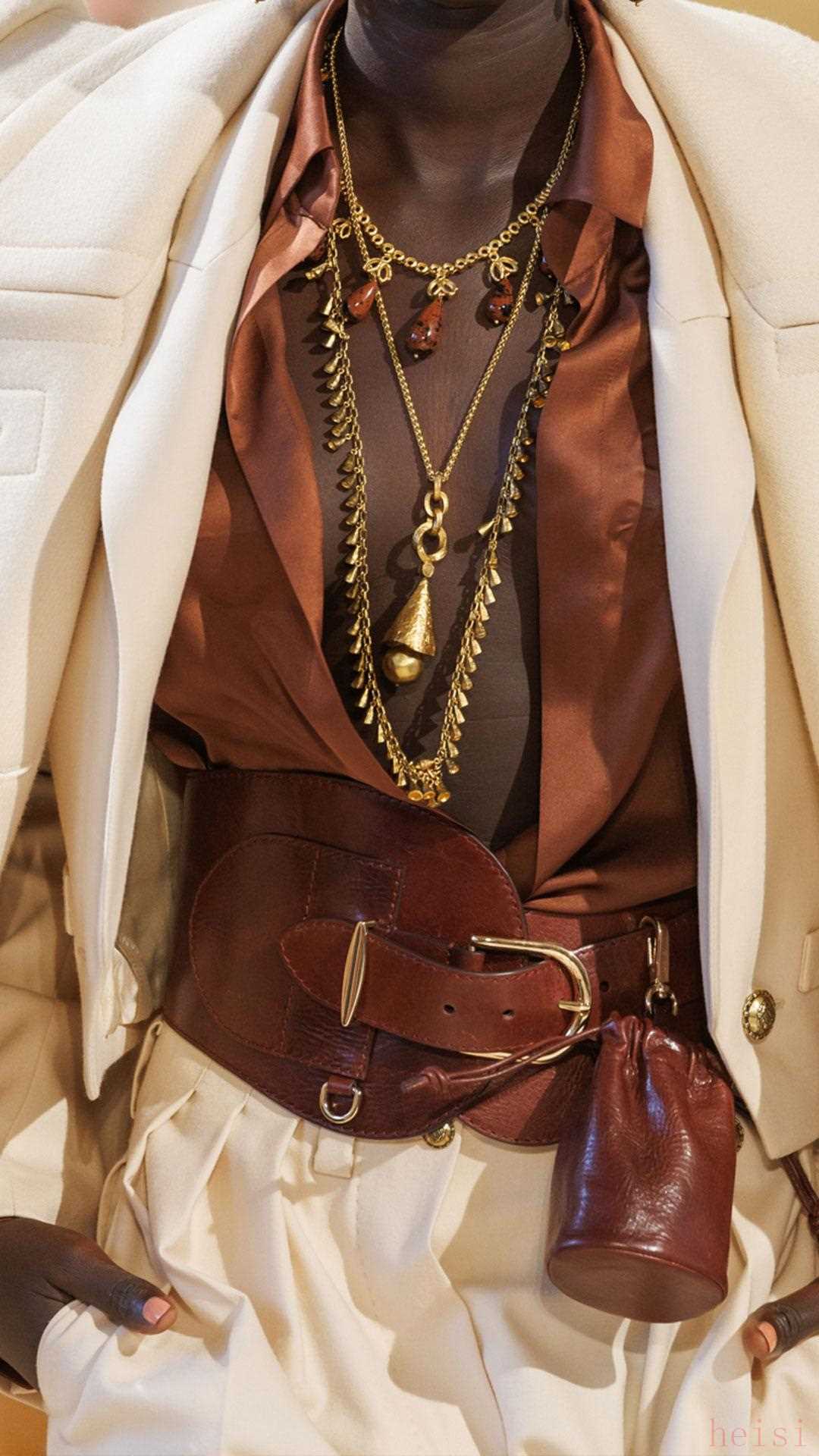 - 配饰点睛:珠饰围巾、绿松石宝石与创意图案的手包,以色为基调进行色彩呼应,仿佛海边清晨的宁静被定格为配饰。