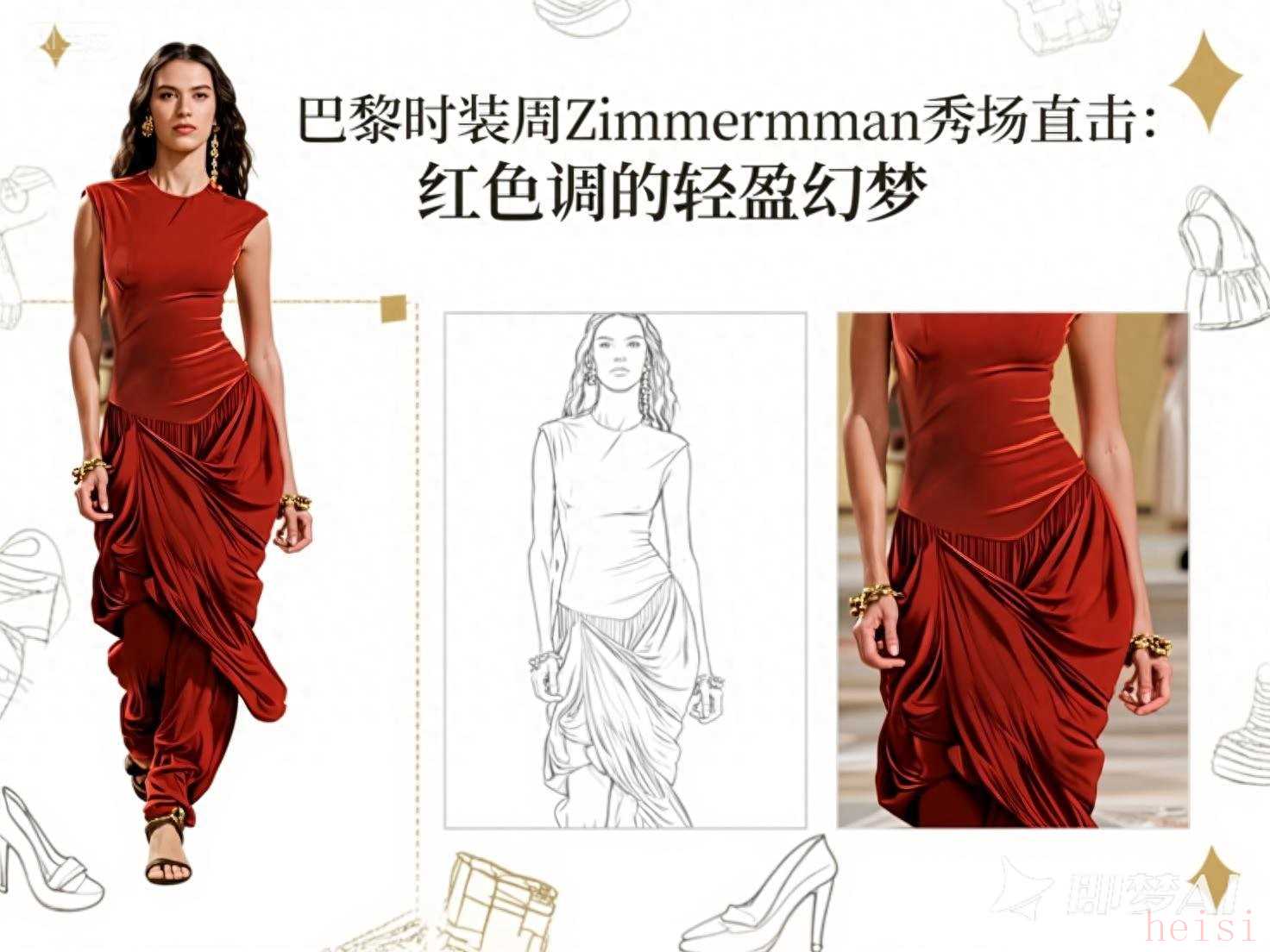这是一份关于巴黎时装周Zimmermann 2025春夏高定系列秀场直击的报道,聚焦于其标志性的红色色调和轻盈幻梦般的氛围: