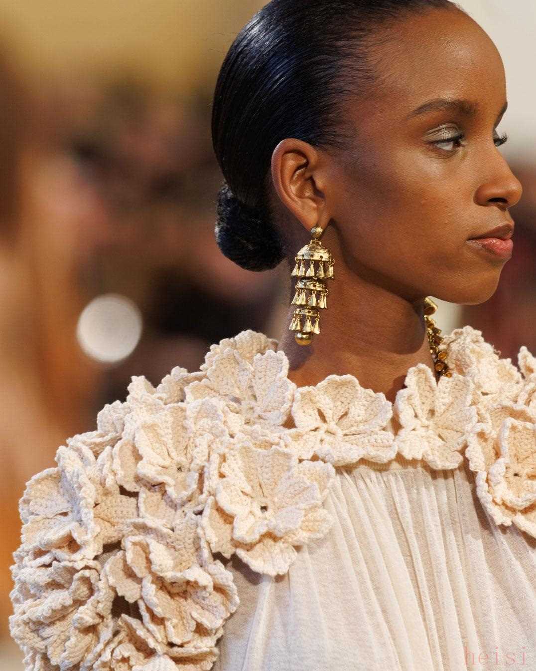 系列中段,一件帐篷式连衣裙成为焦点。层叠的裙摆如花瓣般绽放,3D雕花工艺在薄纱上勾勒出藤蔓与花卉的图案,仿佛将植物学家的素描本穿在身上。模特行走时,裙摆随风扬起,既呼应了自然主题,又通过低饱和度色调传递出宁静的治愈感。