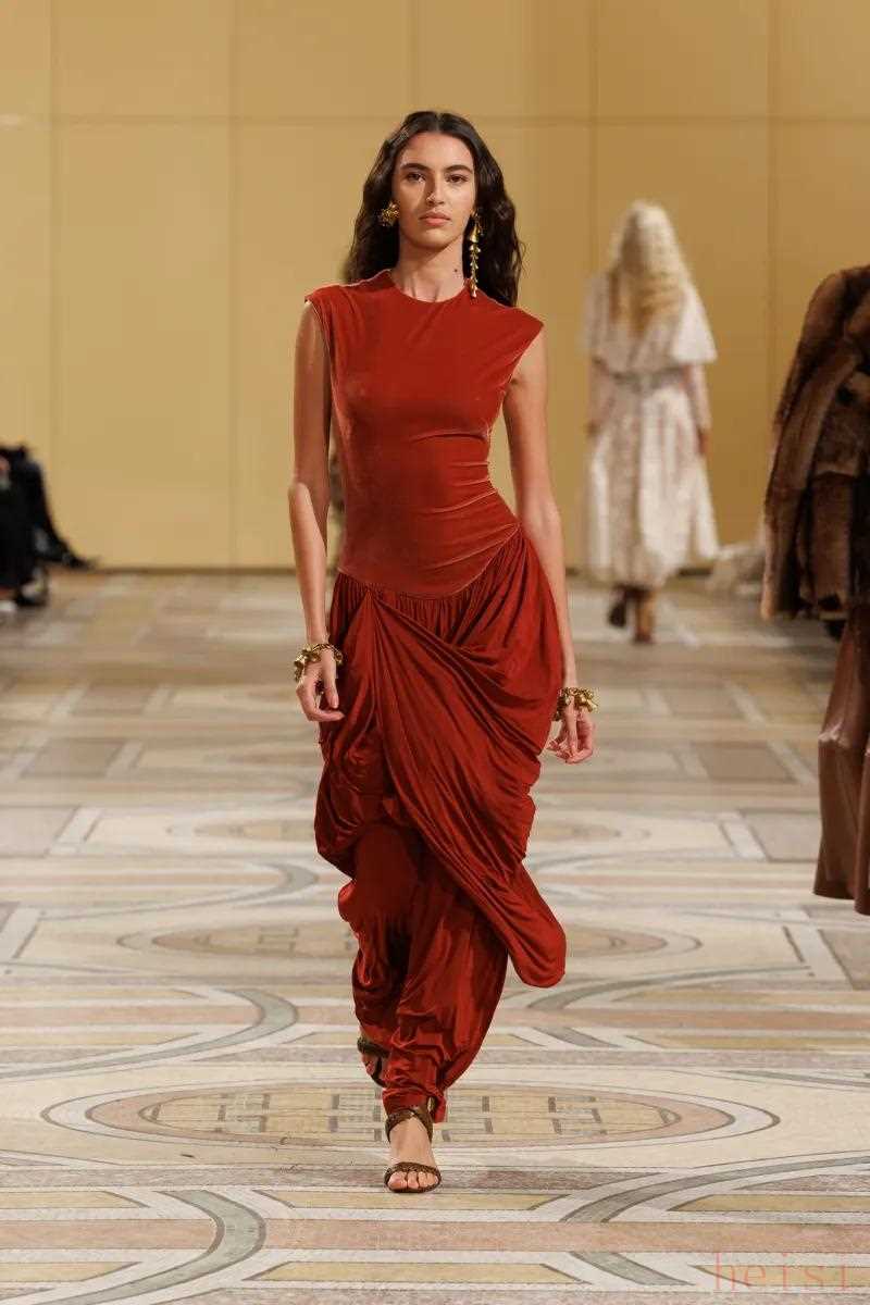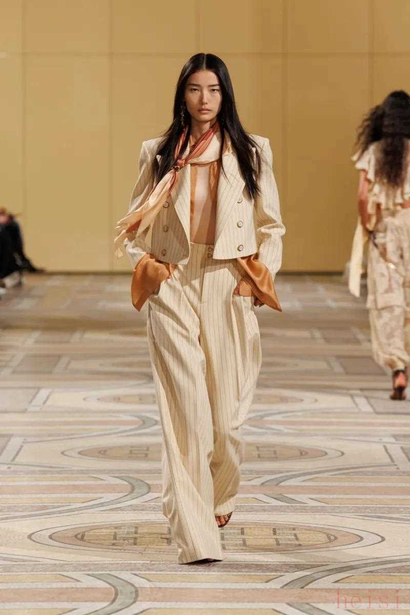 本季Zimmermann的设计灵感源自冲浪文化与自然光影的互动,而红桃色作为核心色调之一,贯穿了整个系列。从开场模特身着的红桃色缎面睡袍,到压轴的奶油色雪纺叠层裙装,低饱和度的柔和桃色(Peach Fuzz)如晨曦般温暖,既延续了2024年Pantone年度色的浪漫基因,又通过3D雕花、印花等工艺注入自然生命力。