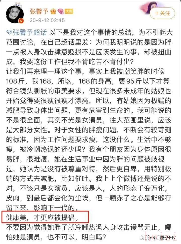 当然,作为女生也要适当放下“身材焦虑”2020年,张馨予也曾谈过身材的问题身高1米68的她,108斤被嘲笑胖她表示“对于女性的胖瘦问题,不断会有较苛刻的标准因为工作问题要求瘦,这没什么生活中不够瘦,被冷嘲热讽的还少吗?健康美,才更应被提倡”