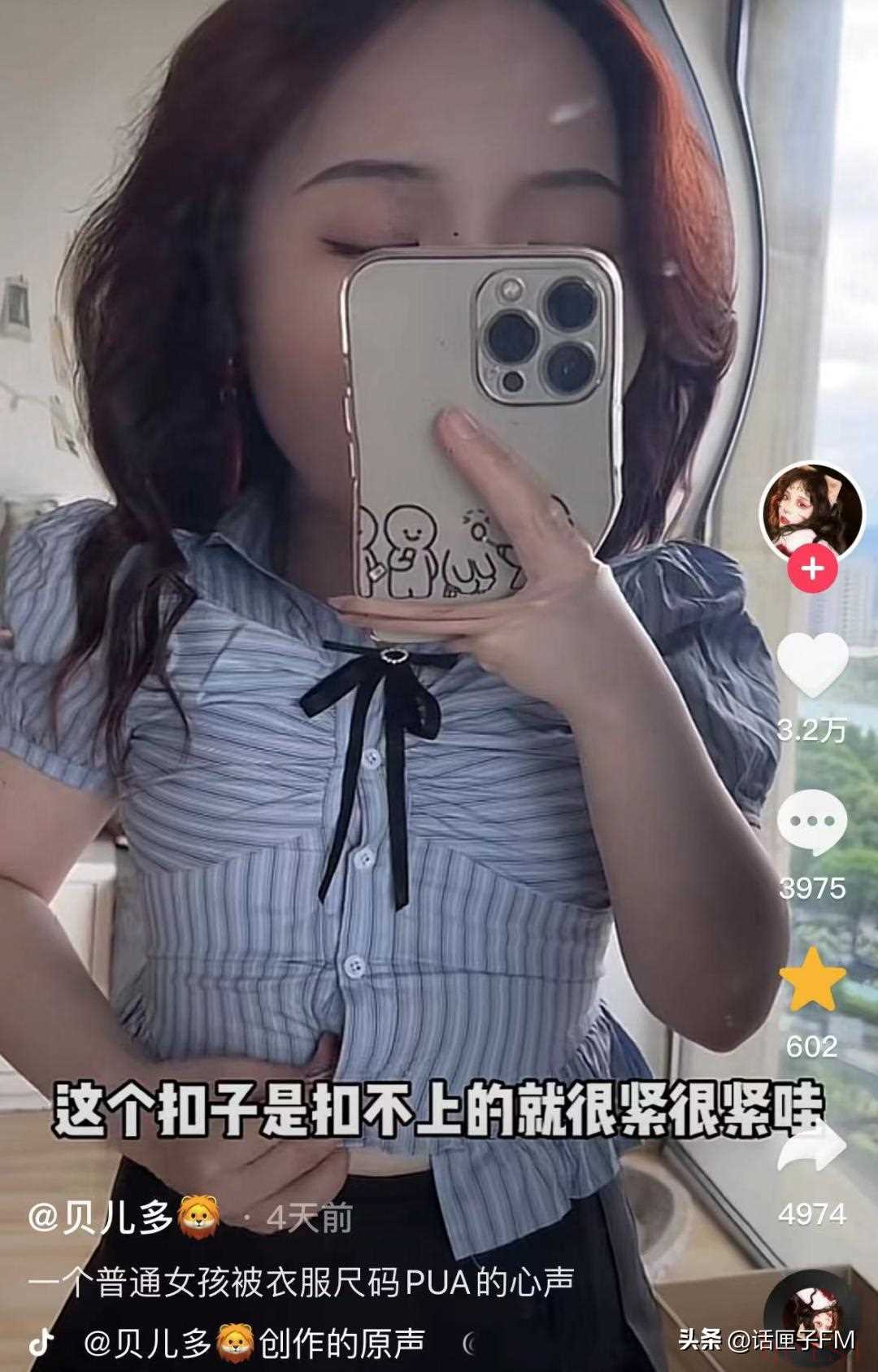 另一名身高1米57,体重100斤的博主也发视频吐槽“M码的衣服,居然连扣子都扣不上觉得自己像有罪一样”她不由发出感叹:“感觉被衣服PUA了”