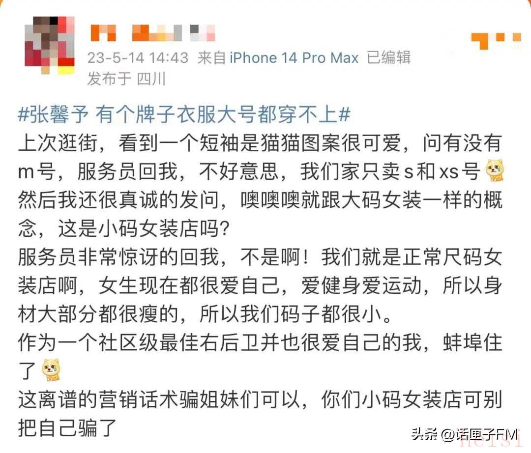 商家可以基于市场潮流风向来打版但默认并制造隐形的身材歧视就真的太离谱了你可以有小码服装但是不可以把尺码越做越小可以做XXXS但不能把S做成童装气愤的网友甚至想摇醒秦始皇重新统一一下度量衡