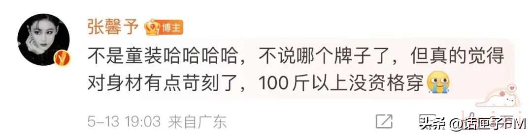 她还回复网友称:“不是童装”“真的觉得对身材有点苛刻了100斤以上没资格穿”