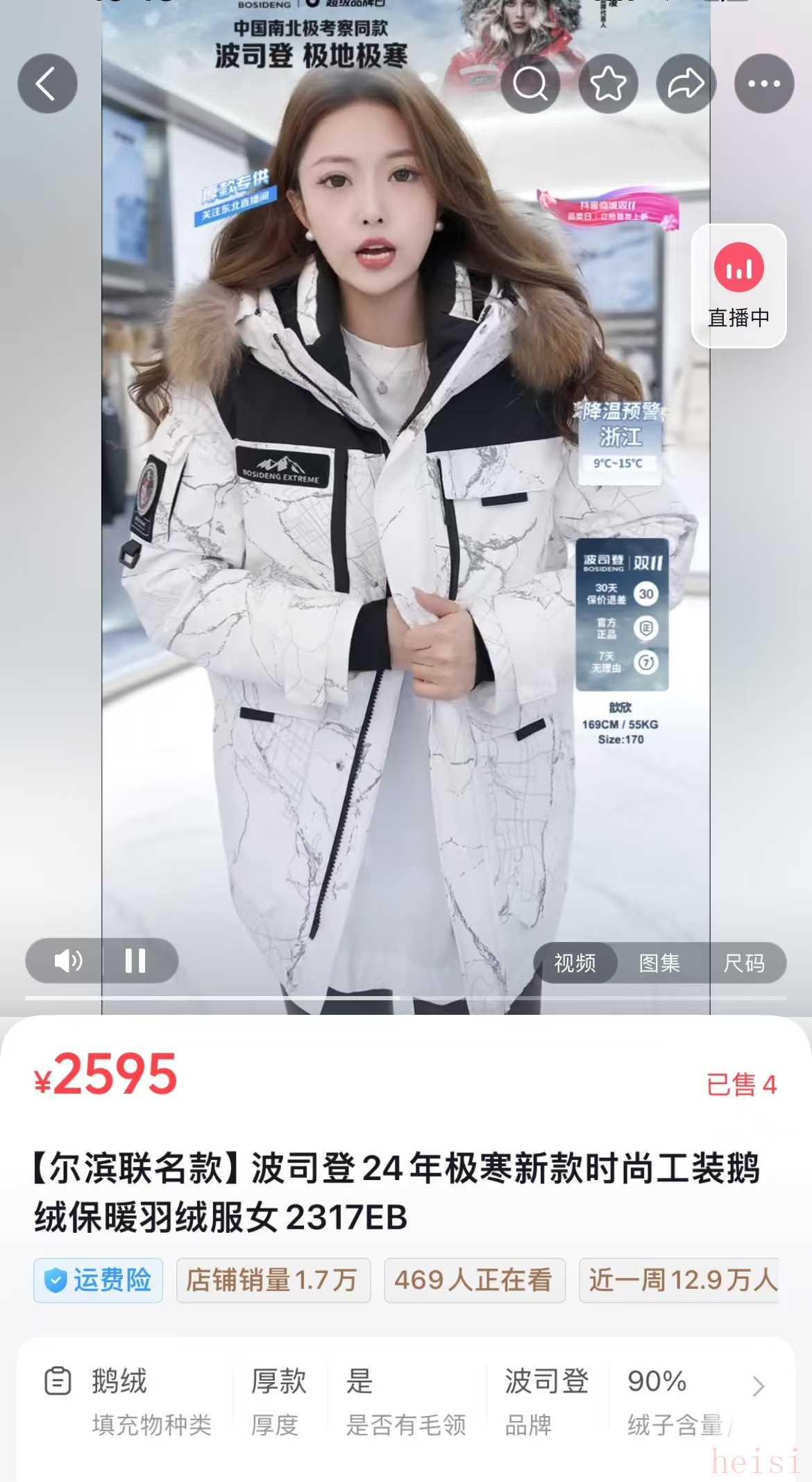 目前,在抖音平台上,由苏州波司登电子商务科技有限公司运营的波司登哈尔滨专卖店,已经上架了一款“尔滨&波司登”联名产品,该产品设计延续了波司登“王牌”产品极寒系列的设计。与非联名极寒系列产品相比,联名产品结合了哈尔滨城市路网图、松花江和黑龙江地形图等本土元素,臂章上面有红色尔滨字样,材料科技也有所升级,销售价格为2595元/件。