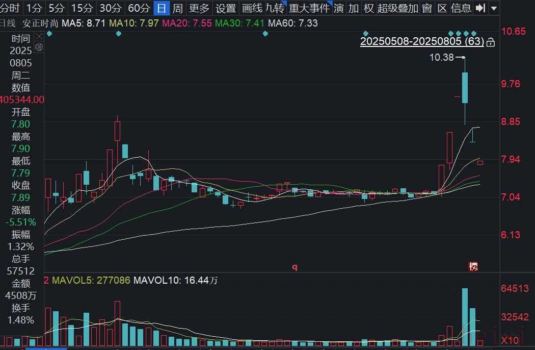 在长达两个月的横盘整理后,近期安正时尚(603839.SH)突然上演了一出惊心动魄的股价"过山车"大戏。7月29日至31日,该股连续三个交易日强势封板涨停。然而8月1日行情急转直下,早盘虽再度冲击涨停,但遭遇巨额抛压,股价快速反转超跌7%以上,最终收跌1.69%。8月4日该股直接以跌停价开盘并维持至收盘,5日开盘继续跌超5%,十分接近 “A”字杀。