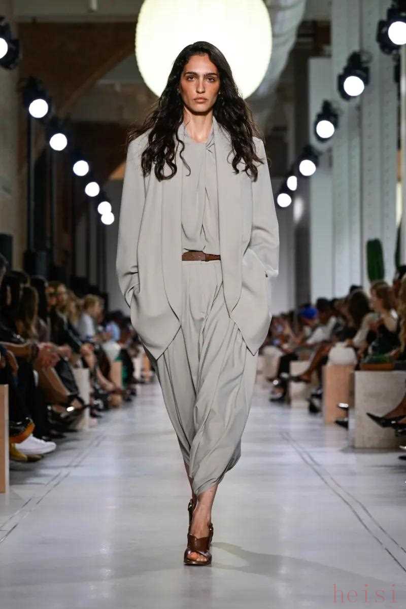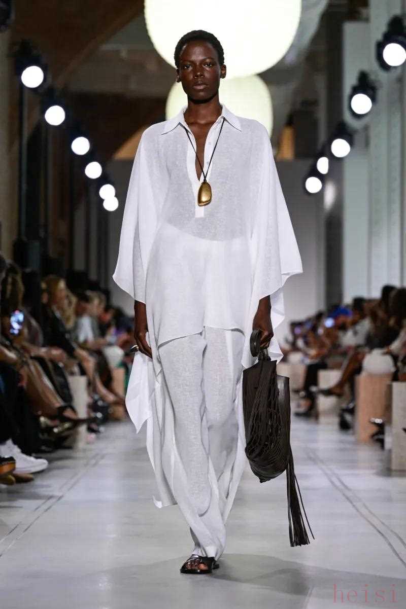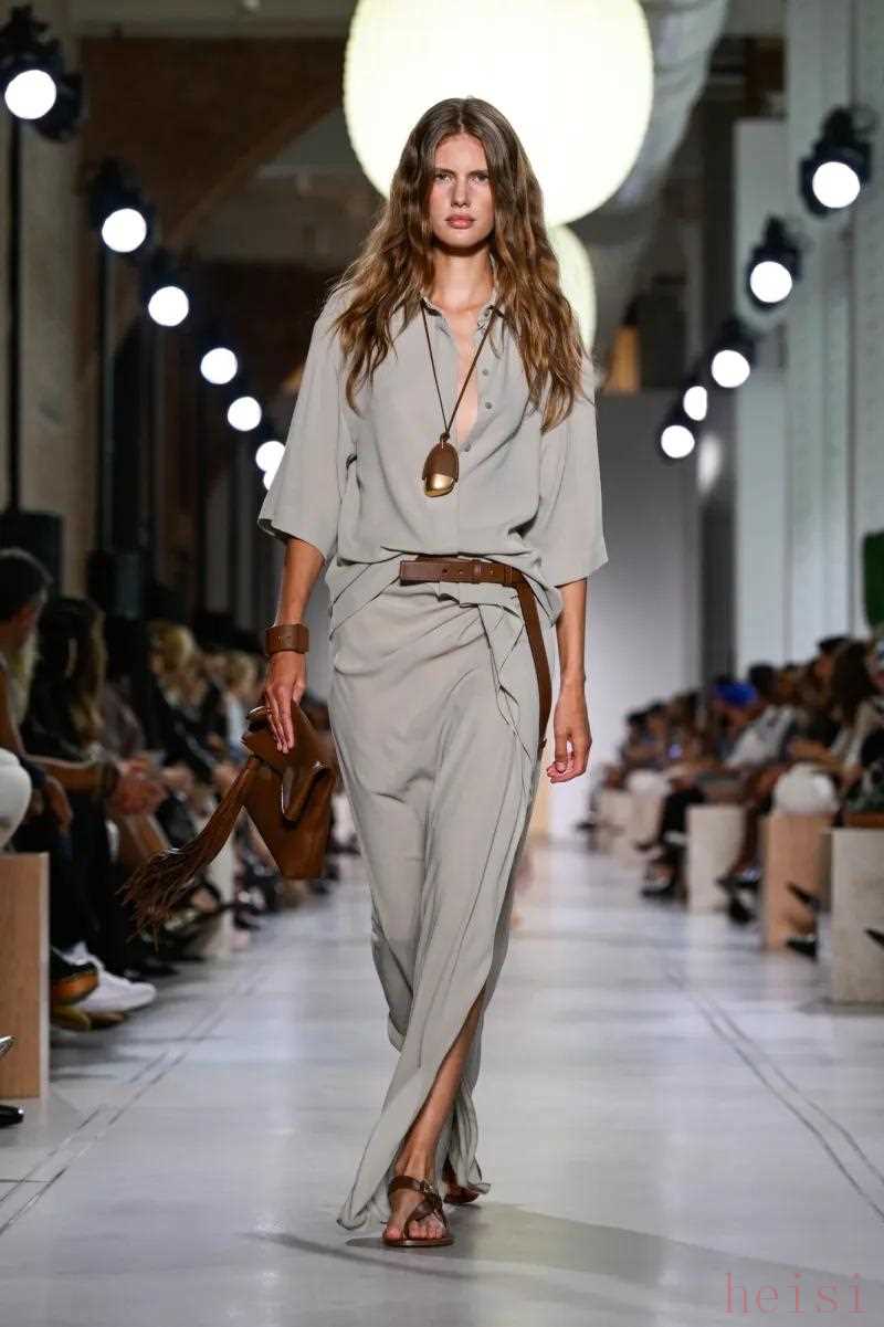 本季全新系列以轻盈、舒展、从容为设计灵魂,将春夏时节特有的灵动气息融入每一件单品之中。设计师巧妙运用柔滑如水的褶裥工艺,配合细腻入微的剪裁手法,让沙龙裙的裙摆如涟漪般自然舒展,丝质睡衣套装在垂坠感中透出慵懒的精致,阔腿裙裤则以流畅的线条诠释都市女性的洒脱姿态。这些单品共同营造出一种不费力的优雅,仿佛春风拂过般自然松弛。飘逸的长袍采用空气感面料,搭配宽松剪裁的上衣,行走间衣袂翩然,自带流动的诗意;而镂空麂皮与亮片的创新组合,则通过若隐若现的透肤设计,让轻透丝纱在阳光下折射出璀璨光影,完美演绎春夏的明亮通透与灵动层次。