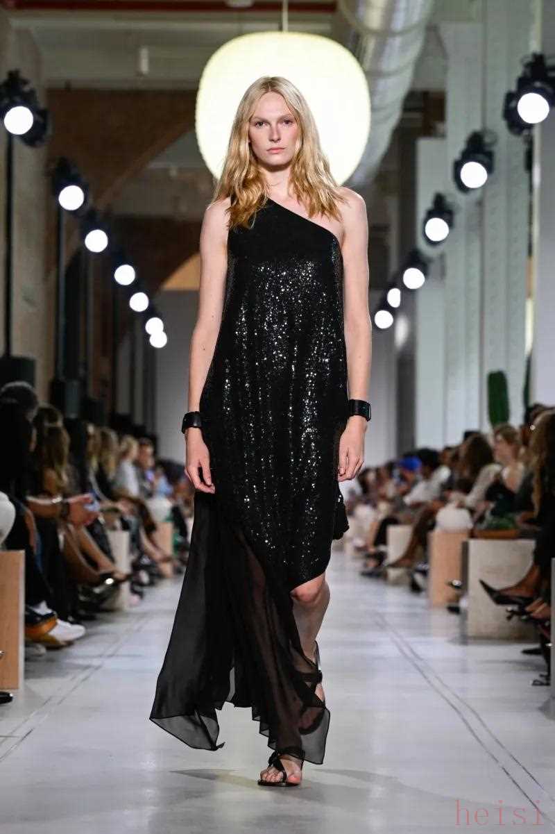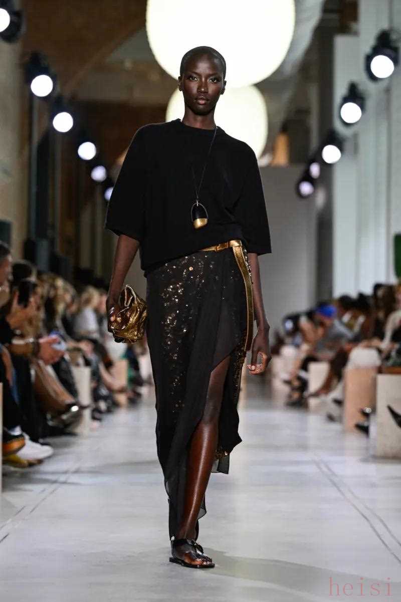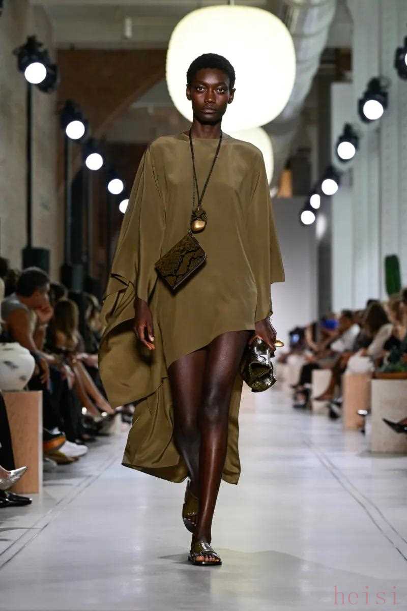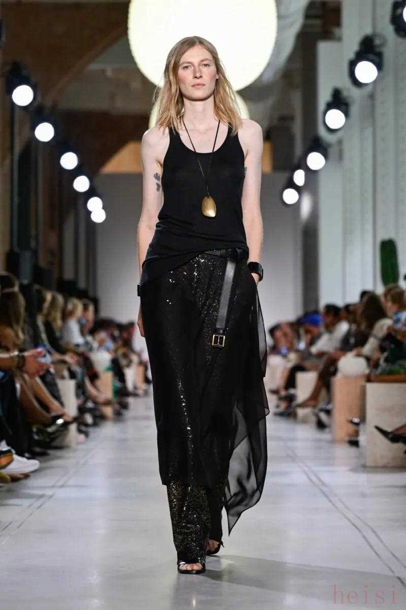 本季全新系列以轻盈、舒展、从容为设计灵魂,将春夏时节特有的灵动气息融入每一件单品之中。设计师巧妙运用柔滑如水的褶裥工艺,配合细腻入微的剪裁手法,让沙龙裙的裙摆如涟漪般自然舒展,丝质睡衣套装在垂坠感中透出慵懒的精致,阔腿裙裤则以流畅的线条诠释都市女性的洒脱姿态。这些单品共同营造出一种不费力的优雅,仿佛春风拂过般自然松弛。飘逸的长袍采用空气感面料,搭配宽松剪裁的上衣,行走间衣袂翩然,自带流动的诗意;而镂空麂皮与亮片的创新组合,则通过若隐若现的透肤设计,让轻透丝纱在阳光下折射出璀璨光影,完美演绎春夏的明亮通透与灵动层次。