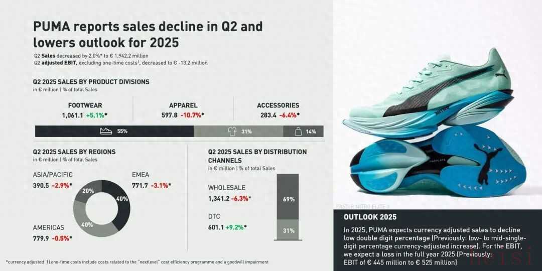 最新发布的2025年第二季度财报更是令人担忧。彪马销售额经汇率调整后下降2.0%至19.42亿欧元,调整后息税前亏损1320万欧元,季度净亏损高达2.47亿欧元。