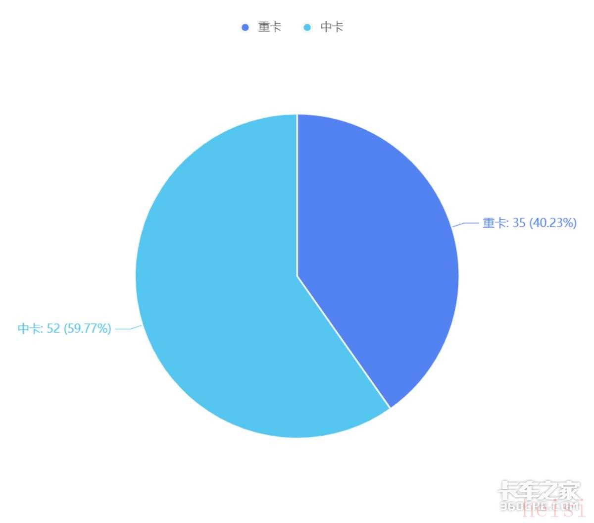 在吨位划分中,中卡主要涵盖的是两轴载货车,包含5.8米、6.8米、9米6等一众车型,而重卡则是6X2和8X4载货车,因此从统计数量来看,中卡总体数量会多一些。