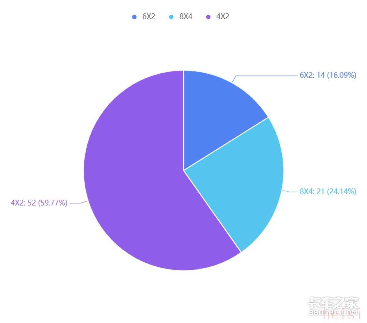 在驱动形式方面,大家的选择又有什么不同呢?在此次统计的87台黄牌载货车中,驱动形式分布具体数据如下: