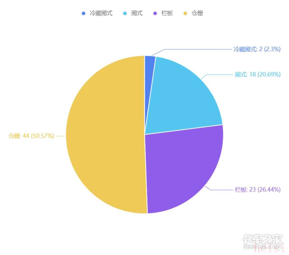 从数据上可以发现,匹配仓栅上装的载货车出现频率最高,要知道仓栅货厢号称“万金油”,有着出色的拓展性和适应能力。从我们实际调研当中也能发现,仓栅车多装的是日用百货、零担散杂以及家具家电、五金机械等产品,可以轻松应付不同的运输场景。